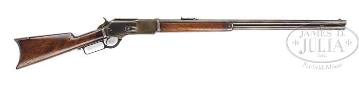 WINCHESTER 1876 LEVER ACTION RIFLE. SN 26194. Cal. 45-60. 28″ rnd bbl, full mag, modified half-nickel front sight, ladder rear sight, usual bbl markings. Standard receiver mounted with straight grain walnut, straight grip, crescent steel buttplate with trapdoor, standard forend with nose cap. CONDITION: Fine. Bbl retains thinning orig blue blending with brown and silver patina; some areas lightly cleaned and normal nicks, dings and scratches. Mag tube has been cleaned and retains a gray mixed with brown patina, some fine surface oxidation marks and some light scratches on right side. Receiver retains orig blue on side plates, thinning on edges and blending with silver and brown patina. Body of receiver appears to have been cleaned years ago and has traces of blue blending with gray patina. Hammer shows dark orig case coloring and slightly silvering on sides. Lever is a dark patina. Stock is sound with numerous shallow dents and normal nicks and scratches and retains an open grain hand worn oil finish. Forend is sound with numerous nicks and shallow dents, slightly dark at receiver and nose cap and carries and open grain, hand worn oil finish. Mechanics are crisp with dark bore and scattered pitting. 4-37524 BDT299 (3,000-5,000)