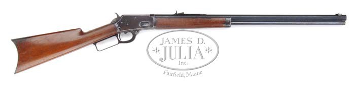 SCARCE MARLIN MODEL 1888 LEVER ACTION RIFLE. SN 23791. Cal. 32 WCF (32-20). Standard grade rifle with 24″ oct bbl, replacement Kentucky rifle-style front sight & Marlin semi-buckhorn rear sight. Mounted with nicely figured, slab-sawed, uncheckered American walnut with straight stock & crescent buttplate. Note: According to the book Marlin Firearms, Brophy, a total of only 4,814 of these rare rifles were ever produced of which only about 1,298 were in caliber 32. PROVENANCE: Leland Clapp Collection. CONDITION: Fine plus. Bbl & magazine tube retain 92-94% strong orig blue, slightly thinner on magazine tube with a few scattered spots of light surface rust. Receiver retains 65-70% thin orig blue turning plum. Wood is sound with usual nicks & dings and some light bruises on left side of buttstock. Forearm retains 25-30% orig varnish with balance a hand worn patina. Buttstock retains 75-80% orig varnish with a worn patina around wrist. Mechanics are fine, strong dark bore. 4-36052 JR33 (2,500-3,500)
