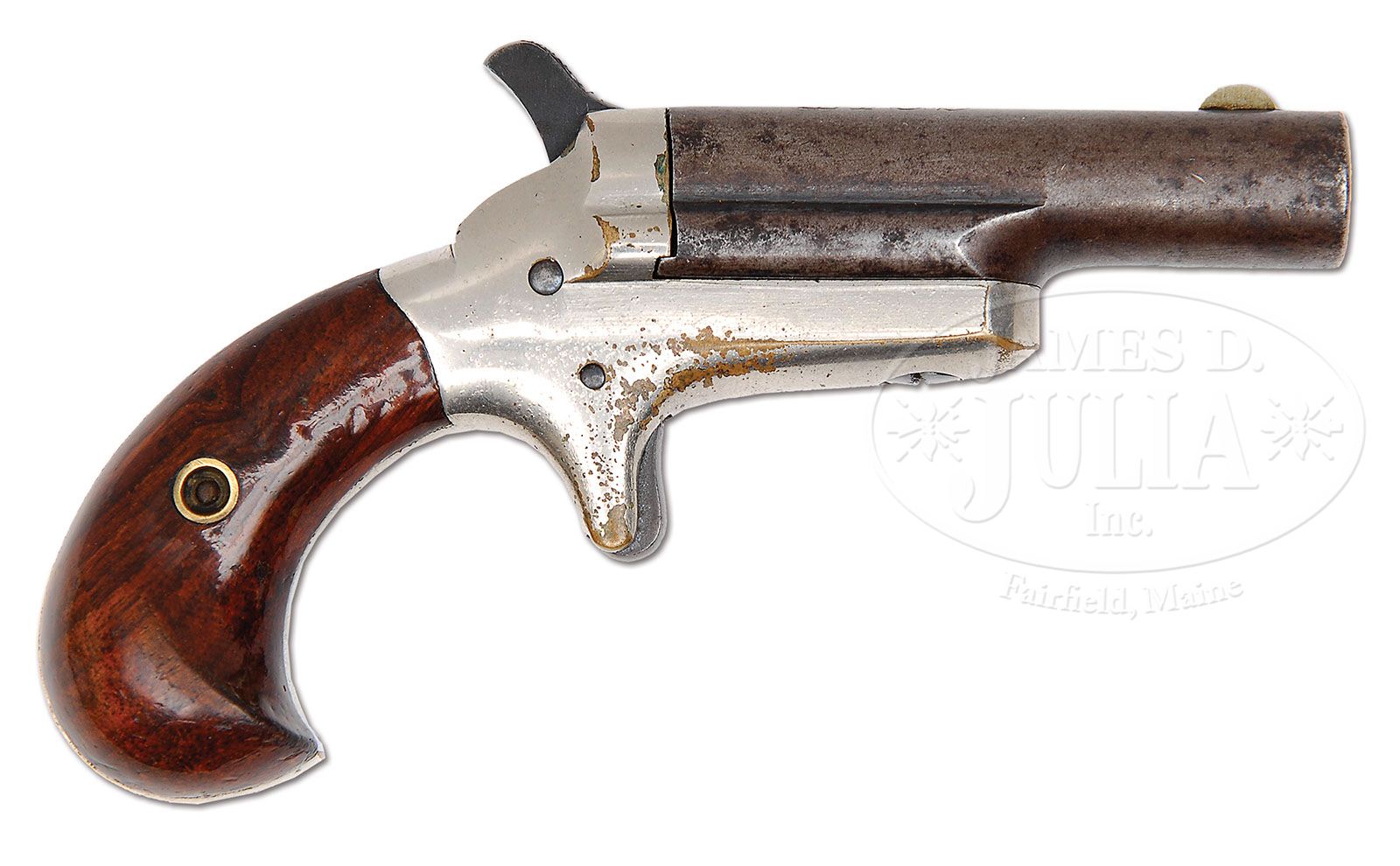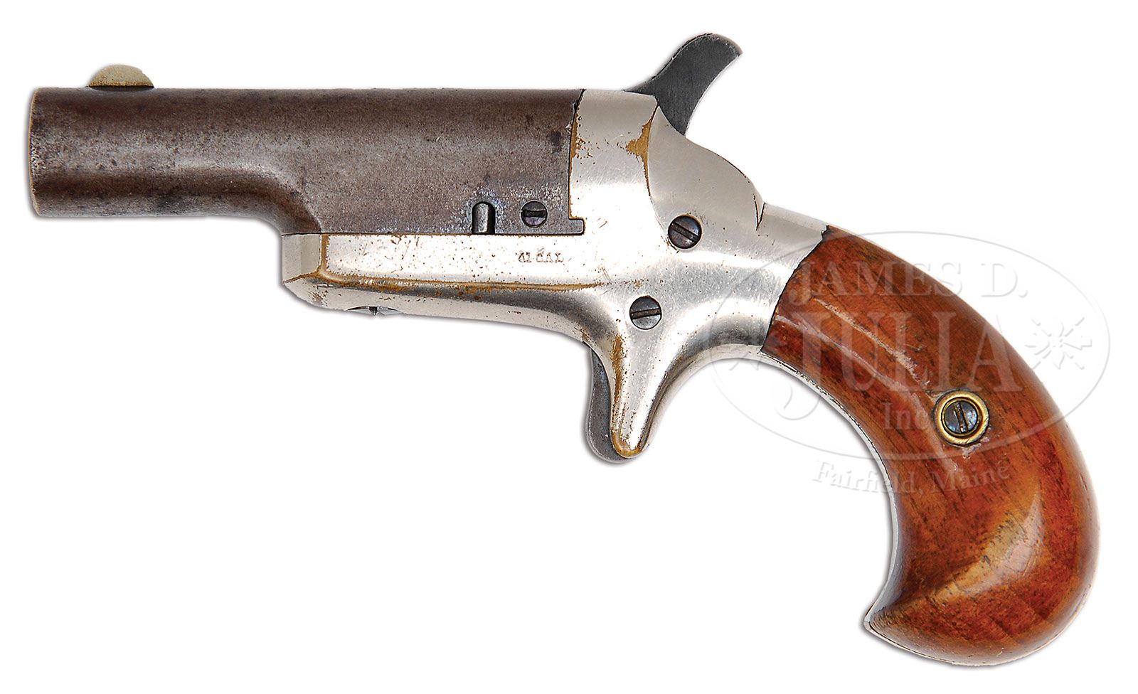 COLT PAT. F.A. MFG. CO. 3RD MODEL DERINGER 5TH VARIATION. SN 43601. Cal. .41 Short RF. English proofed and sold in London, England by F.T. Baker, 88 Fleet St. It has an unusual marking, in that it has engraved on the backstrap ” F.T. Baker GUN MANUFACTURER LONDON” along with the standard dealership address. Finished in standard nickel and blue with walnut grips. PROVENANCE: L.D. Eberhart Collection. CONDITION: Gun was orig finished with blued bbl and screws and nickel frame. Marked “41 Cal” on left side of frame and has English proofs and the rare backstrap marking. Normally the engraving would have the Fleet St. address. Both are correct. Bbl retains only traces of orig blue in protected areas. Has nice overall patina over rest of bbl with some salt and pepper pitting at the muzzle end on right side. Brass frame, which is overall nickel, does have some flaking around trigger housing area area on right side and some wear to edges on left side of recoil shield and edge of trigger housing area. The F.T. Baker markings are nearly perfect in every respect but do have some flaking on “Baker” because of the engraved address, in every instance, was cut through the finish. Walnut grips have minor wear but retain 90%+ of orig varnish. A very hard dealership marking to obtain. 4-47467 DE87 (900-1,500)