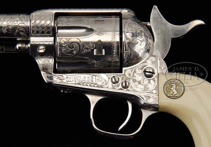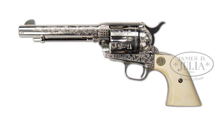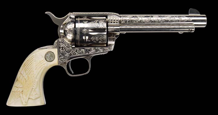 *FINE ENGRAVED COLT SINGLE ACTION ARMY REVOLVER. SN 342403. Cal. 45 Colt. Nickel finish with 5-1/2″ bbl and mounted with deep relief carved eagle ivory grips with silver Colt medallions. Grips may be later replacements. Left side of the frame has 2-line, 3-patent dates and rampant Colt in a circle with caliber marking on left side of bbl. Serial number was observed on left side of the grip frame, underneath the grip. Frame, cylinder, bbl, back strap & trigger guard are beautifully engraved in New York style with full coverage intertwined foliate arabesque patterns on the frame with small flower blossoms in the lower front gullets. Each side of the bbl boss is engraved in a checkerboard pattern with feather patterns down the top strap. Matching foliate arabesque patterns extend most of the length of the bbl with a well-executed fan pattern at top of the back strap. Cylinder is engraved in Helfricht style with foliate arabesque patterns on lands between the flutes and a foliate spray at rear edges of flutes and a scalloped border around the rear edge. Accompanied by a Colt factory letter identifying this revolver in .45 cal. with 4-3/4″ bbl, blue finish, sold to G.D. Willis and shipped to Bronson & Townsend, New Haven, CT on March 6, 1922 in a one gun shipment. PROVENANCE: Ted Knee Collection. CONDITION: Extremely fine. Overall retains virtually all of its fine orig nickel finish with one small pencil eraser sized spot of pitting on left side of muzzle. Appears to be new & unfired. Grips fit well and retain a fine mellow ivory patina. Mechanics are crisp, bright shiny bore. 4-36596 (22,500-27,500)
