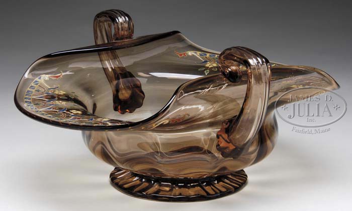 FRENCH ENAMELED CENTER BOWL. Unusual large rolled rim rum colored center bowl has two applied glass handles and is decorated with an Art Nouveau floral pattern in colors of blue, yellow, green and mauve. This center bowl is made in the style of Galle. Unsigned. SIZE: 6-3/4″ t X 13-3/4″ dia. PROVENANCE: From the Private Collection of Dorothy Lee Jones. CONDITION: Very good to excellent. 5-61785 (1,000-1,500)