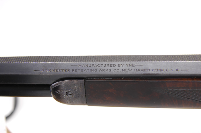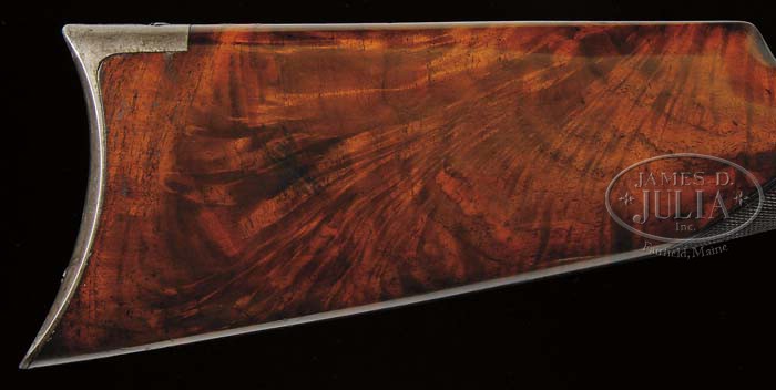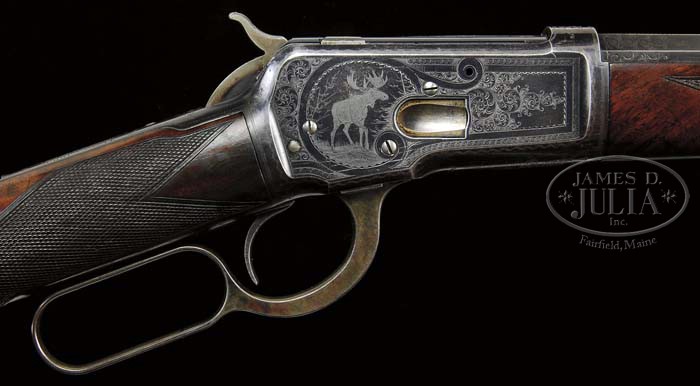 RARE ENGRAVED WINCHESTER MODEL 1892 DELUXE LEVER ACTION RIFLE. SN 74916. Cal. 32 WCF (32-20). Beautiful little rifle with 24-1/4″ oct bbl, full magazine, ivory bead combination front sight and semi-buckhorn rear sight. Top flat of bbl is full matted. Mounted with very highly figured, center crotch, flame grain American walnut with “H” style checkered forearm and straight stock with crescent buttplate. Receiver is beautifully engraved, probably by Conrad Ulrich with a large No. 6 elliptical vignette on left side of a Whitetail buck & doe in a mountain scene, surrounded by foliate arabesque patterns with wavelet borders. Left front of receiver is engraved in a ribbon in period script “C.F. Boetticher”. Right side is engraved with the vignette of a No. 9 bull moose in a forest scene surrounded by foliate arabesque patterns and matching wavelet borders. Both sides of receiver are completely surrounded by wavy line borders with snake & dot borders on top edges. Top & bottom of receiver are engraved in foliate arabesque patterns with fine line borders at front & rear edges and around top tang. The lever & locking bolt opening on bottom of receiver is surrounded by an engraved rosette. Sides of the forend cap & buttplate tang are lightly engraved also. Left side of lower tang is unmarked and the top tang channel of buttstock appears to have had an assembly number removed. Toe of buttplate is also unmarked. When buttplate was removed a small receipt was found rolled up in the hole in the buttstock. It is an old receipt, probably for this rifle, dated “South Eastern Mass Sept 6 1930”, “Received from E.F. Belcher”. The amount was $15.00. On another line it has the information “Paid by Joseph H. Rogers for rifle” and is signed “James H. Rankin”. Back of receipt is a pencil notation “This rifle belongs to J.H. Rogers Brook– / So Paris Maine” and signed “Joseph Rogers 1-16-73”. Also accompanied by a Cody Firearms Museum letter which identifies this rifle in 32 caliber with oct, matted bbl, plain trigger, fancy checkered stock, engraved $10.00 and also engraved “C.F. Boetticher”, received in warehouse Jan. 4, 1898 and shipped the next day to Order #119. PROVENANCE: Wes Adams Estate Collection. CONDITION: Fine to very fine. Bbl retains about 95% strong orig blue with light sharp edge wear; magazine tube retains 95-97% strong orig blue; receiver retains 85-90% thinning orig blue; lever & hammer retain strong case colors on sides, faded on outer faces and top edge; buttplate retains smoky case colors, mostly turned silver; wood is sound with light nicks & scratches with the forearm retaining most of an old refinish and the buttstock most of its orig piano varnish finish; checkering shows moderate diamond point wear; buttstock may be an old replacement. Mechanics are fine, bright shiny bore with a few scattered spots of light pitting. 4-44597 JR343 (25,000-40,000)