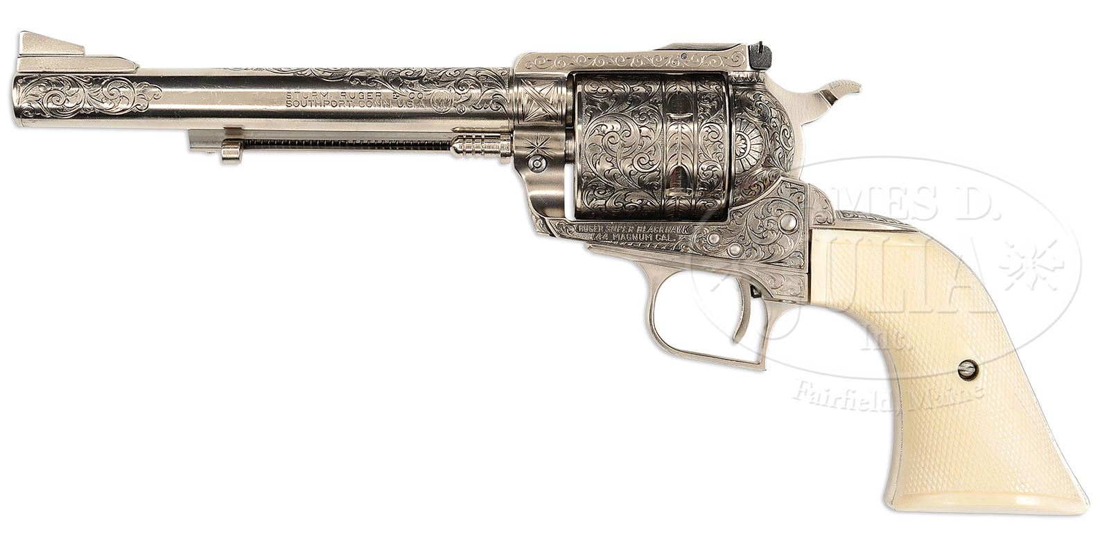 *CUSTOM ENGRAVED RUGER SUPER BLACKHAWK 44 MAGNUM REVOLVER FROM “BOCEPHUS” COLLECTION. SN 24538. This Ruger Super Blackhawk 44 Magnum with 6-1/2″ bbl was once in the collection of Hank Williams Jr. and has an accompanying affidavit and factory certificate from Ruger Collector’s Association stating gun was from catalog number S47 with following features, “.44 Magnum Caliber, 6-1/2” barrel, steel Dragoon style grip frame, ribbed cylinder frame, super polished finish, micro rear sight, patridge ramp wide front sight, walnut grip panels, black Ruger “eagle” grip medallion, serial number size: 1/8″, action type: “Old Model” single action. The 6-1/2″ barrel S47 was produced during 1966 only.” Gun has since been fully engraved and had checkered ivory grips with “bear” vignette on right side added. The orig wood grips accompany the pistol also. PROVENANCE: Hank Williams, Jr. Collection. CONDITION: The gun is in very fine to excellent condition overall retaining most of its orig finish with engraved initials on backstrap of “DRW”. The date “1998” is engraved on a scroll on frame flat. The “ivory” colored grips were not removed to see what material they are made of but appear to be elephant ivory but fit loosely. Action is crisp and bore is shiny and well defined. 4-49363 (4,000-6,000)
