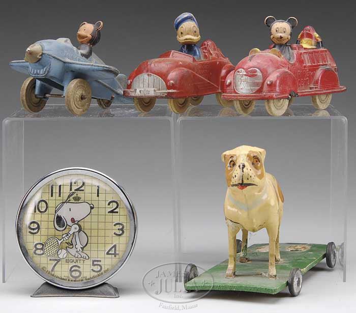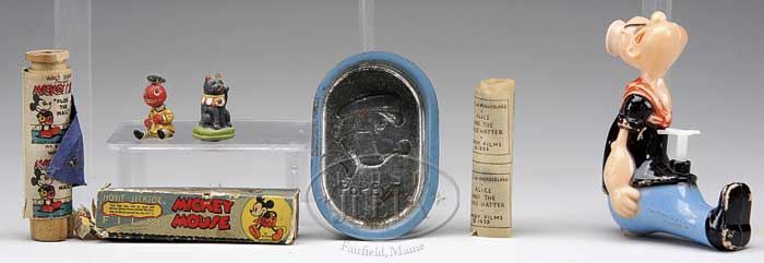 LARGE LOT OF CHARACTER & MISCELLANEOUS TOYS. Lot includes Sun Rubber Mickey in airplane, Mickey in firetruck, Mickey on tractor, Donald in firetruck, two Disney child umbrellas, scarce Mickey Mouse canoe, Popeye sand toys on card, celluloid Popeye baby rattle, Pelham Mickey marionette, Jackie Coogan pencil box, Charlie McCarthy soap in original box, Charlie Chaplin celluloid (Italian) figure, Porky Pig chalkware figure, Spear Donald Duck jack in the box plus dozens of character and other miscellaneous toys. SIZE: Varies. PROVENANCE: Barbara J. Thornsjo Estate, Albion, Maine. CONDITION: Averages good. 1-10738 (300-500) Auction: Advertising, Toy & Doll - Spring 2011 Please Note: All prices include the hammer price plus the buyer’s premium, which is paid by the buyer as part of the purchase price. The prices noted here after the auction are considered unofficial and do not become official until after the 46th day. |