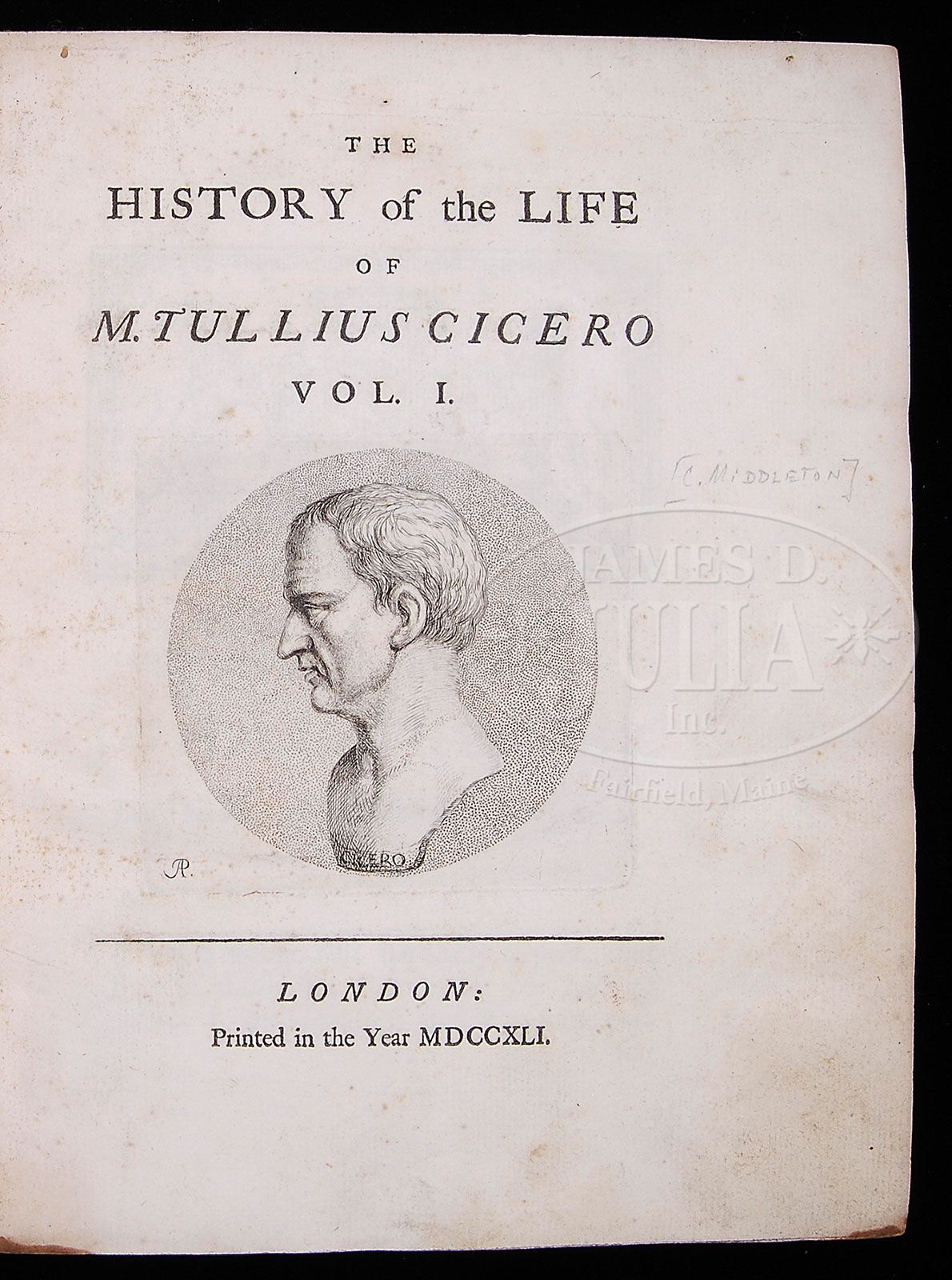 BOOK: LOT OF SIX LEATHER BOUND BOOKS. 1. The commentaries of C. Julius Caesar of his wars in Gallia, and the civil wars betwixt him and Pompey. By Clement Edmonds; London, 1677, 332 pages. 2 & 3. The History of the Life of M. Tullius Cicero, two volumes, London, MDCCXLI. 564 and 591 numbered pages. 4 & 5. The letters of Pliny, the younger… by John Earle of Orrery. Two volumes, London, printed by James Bettenham, MDCCLI. Having two bookplates by Thomas Newnhan and Edward Davenport. 6. The Whole Genuine Works of Virgil, London, printed for Alex. Hoagg. SIZE: 1) 12-1/2″ x 8-1/4″. 2-6) 10-1/2″ 8-1/2″. PROVENANCE: From the private collection and estate of Robert Nugent, Glenridge, New Jersey. CONDITION: Bindings as is, contents appear to be intact. 28323-2 (500-1,000)