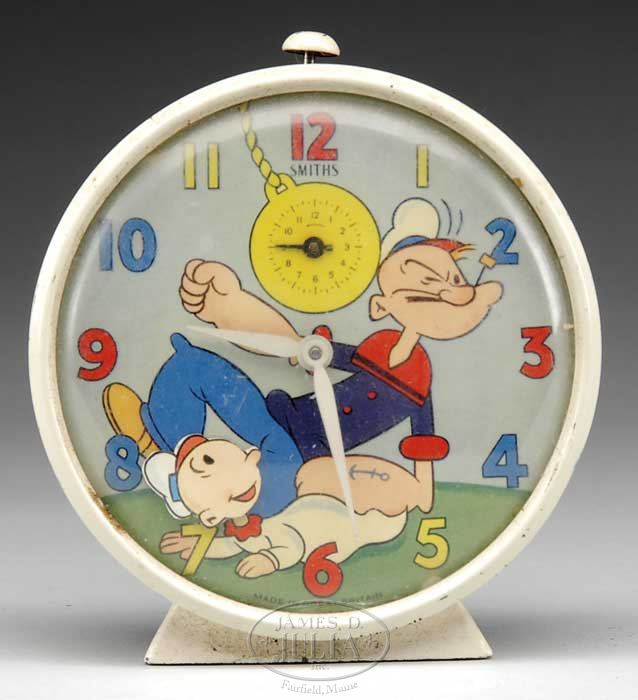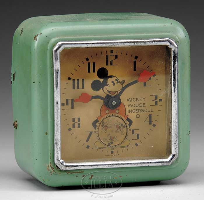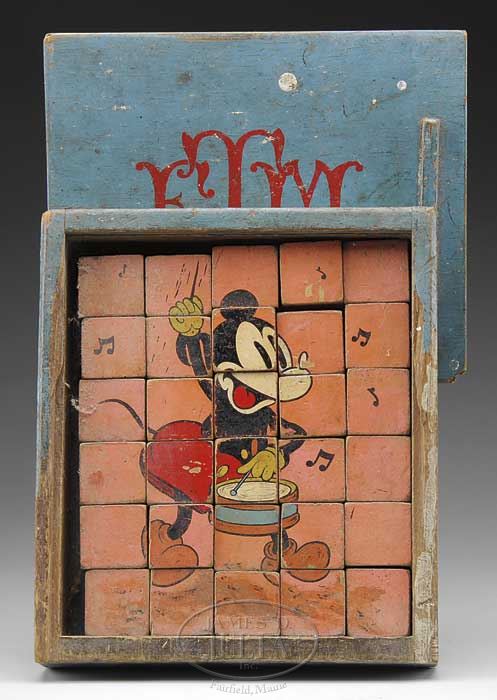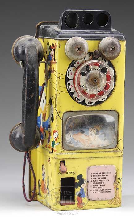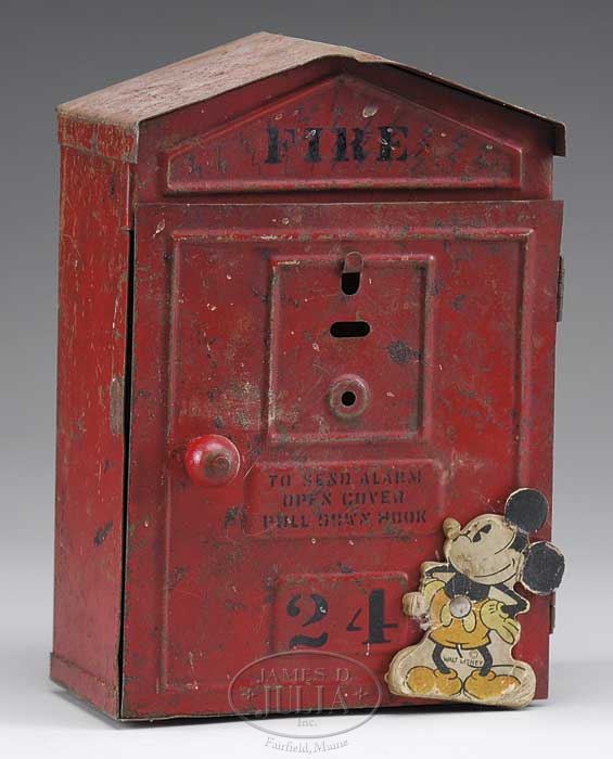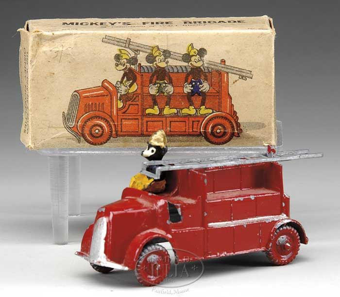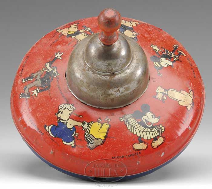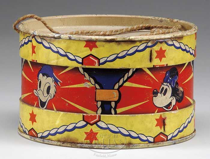 LARGE DISNEY TOY LOT. Approximately 20 pieces, lot includes a boxed “Salco” Mickey firetruck, a large Disney character tin top, Mickey Mouse cookie box, a pair of Mickey & Minnie hand-stitched dolls (from pattern), an English Mickey tin post office still bank, Mickey Mouse Club projector in original box, Disney tin and paper drum, horn and noise maker, British Popeye & Sweetpea animated desk clock, Ingersoll Disney Mickey desk clock and more. SIZE: Varies. PROVENANCE: Barbara J. Thornsjo Estate, Albion, Maine. CONDITION: Averages good. 1-10696 (300-500)