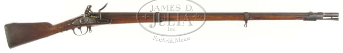 “CITY GUARD” SURCHARGED FRENCH MUSKET. Cal. 69. NSN. Early-mid 19th C. French musket with a “St. Etienne” marked lock. Various small proof letters & numbers are found on various parts of gun. Bottom of stock is stamped in 5/8″ letters “CITY GUARD”. “City Guard” appears to be from one die. City Guard could refer to any of several American cities. Consignor’s notes indicate this was Richmond City Guard’s, and we do not disagree, but we have no way to verify this. CONDITION: Gun appears in as found condition exhibiting gray/black metal with pitting. Stock exhibits numerous dings & gouges. Ramrod has similar matching patina but the end is cut with no threading. 4-58046 JS11 (2,000-3,000)