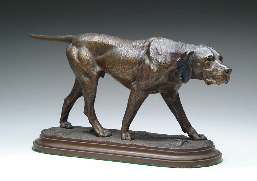 BRONZE DOG. Nice bronze figurine depicts hunting dog at point. Nicely detailed figure has rich brown patina. Unsigned. SIZE: 15 in. l x 7-1/2 in. t. CONDITION: Two small scratches to patina, otherwise very good. Estate of Edwin Schiebel Sr. 5-60045 (300-500)