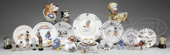 GLASS & CHINA INCLUDING COMIC CHARACTER. Nice selection of American, British, Bavarian and Japanese ceramic and glass character items. Dozens of items featuring a Wade Heath English long billed Donald Duck pitcher, Homer Laughlin Campbell’s Kid plate, several early Mickey children’s bowls and dishes, character Japanese lustreware, American and Japanese figural comic ceramics. Lot also includes three early snow globes including standing bear and black boy. Mickey and Grumpy glass perfume bottles. Great lot with many more interesting surprises. SIZE: Varies. PROVENANCE: Barbara J. Thornsjo Estate, Albion, Maine. CONDITION: Good to very good. 1-10781 (400-800) Auction: Advertising, Toy & Doll - Spring 2011 Please Note: All prices include the hammer price plus the buyer’s premium, which is paid by the buyer as part of the purchase price. The prices noted here after the auction are considered unofficial and do not become official until after the 46th day. |