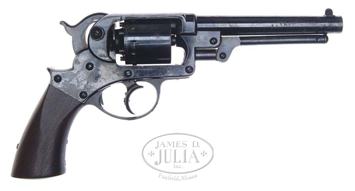 MARTIALLY MARKED STARR DBL ACTION ARMY PERCUSSION REVOLVER. Cal. 44. SN 4815. Blue finish with 6″ rnd bbl, dovetail blade front sight with 1-pc walnut grip. Left side of the grip has a crisp cartouche & there are small inspector initials on the various metal parts. CONDITION: Extremely fine. Probably unfired, overall retains about 80% glossy bright blue with the loss areas flaked to a medium patina. Hammer, rammer handle & pivot retain most of their orig case colors. Grips have a few minor nicks & scratches & retain most of their orig oil finish. Mechanics are crisp, brilliant shiny bore. 4-56095 JR512 (3,000-5,000)