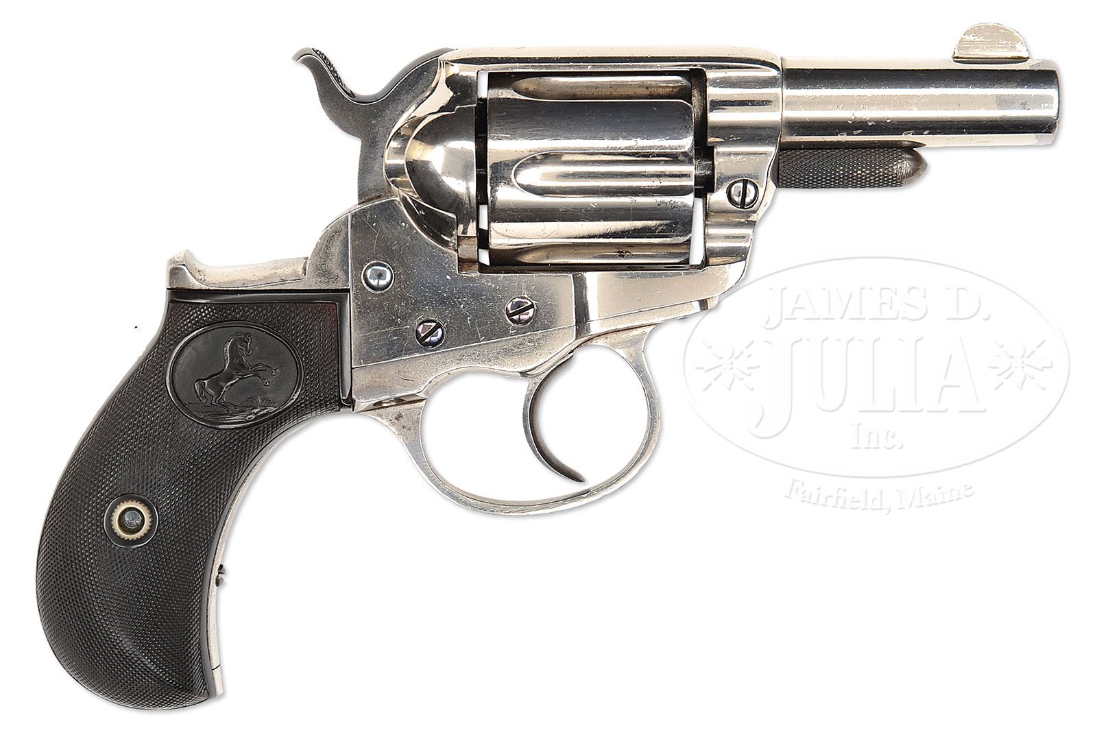Correction: Catalog estimate should read 6,000-7,000. SCARCE COLT MOD. EL 1877 LIGHTNING SHERIFF’S MODEL DA REVOLVER. SN 23536. Cal. 38 Colt. Nickel finish with 2-1/2″ bbl. Half moon on front sight and 2-line address with etched panel “COLT D.A. 38″ on the left side. Left side of the frame has 3-line patent dates and it is mounted with 2-piece Rampant Colt hard rubber grips. Left rear web of trigger guard has the caliber marking. Cylinder is usual 6 shots with long flutes. Accompanied by a Colt Factory Letter that identifies this revolver in 38 cal. with 2-1/2” bbl, nickel finish and rubber grips, shipped to Hartley & Graham, NY, NY on March 1, 1880 in a 75-gun shipment. Lightning revolvers are not terribly uncommon but Sheriff model configuration is quite scarce and those with etched panels are rare. CONDITION: Extremely fine. Overall retains virtually all of its strong orig nickel finish and most of the blue on the screws. Grips are sound and show light diamond point wear. Mechanics are fine. Bright, shiny bore. 4-49411 JR303 (6,000-7,000)