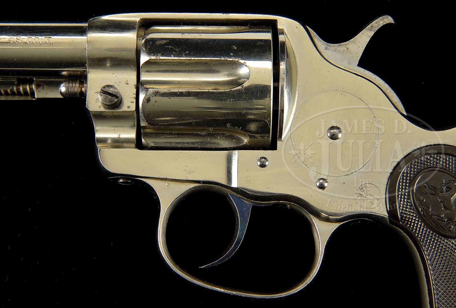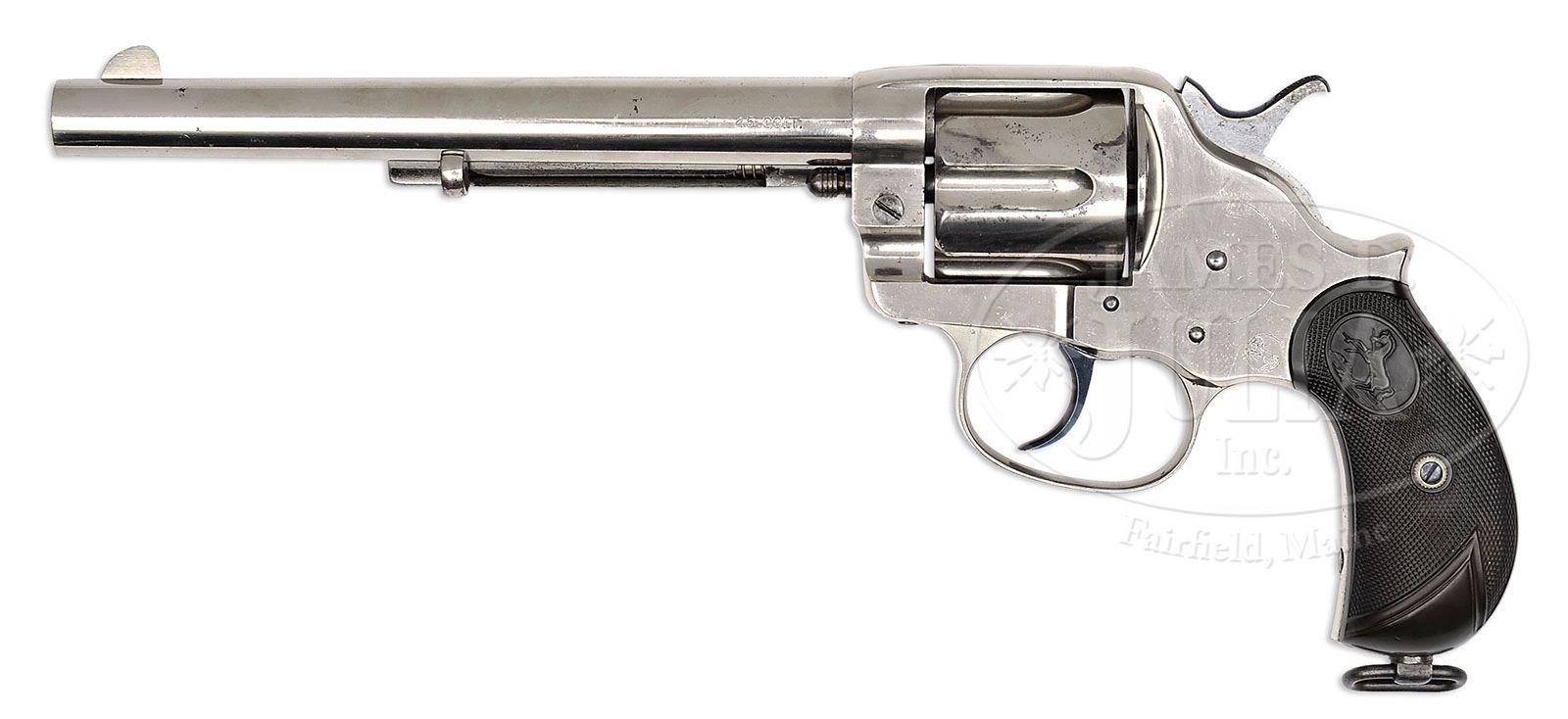 SCARCE COLT MODEL 1878 DA REVOLVER. SN 27452. Cal. 45 Colt. Nickel finish with 7-1/2″ bbl, full front sight and 1-line block letter address with caliber marking on left side. Left rear side of frame has the rampant Colt in a circle. Mounted with 2-pc rampant Colt hard rubber grips and has a lanyard stud & loop in the butt. Cylinder is usual 6-shots with long flutes and last three digits of matching SN on rear face. Trigger & edges of hammer are fire-blued with hammer having bright polished sides. Screws are fire-blued. According to Flayderman’s Guide to Antique American Firearms there were 51,210 of these scarce revolvers were produced in the period 1878-1905 in a large variety of calibers, configurations and bbl lengths in blue & nickel finish. It was Colt’s first attempt at a large bore dbl action revolver and was immediately successful becoming extremely popular throughout the American West, Northwest Territories and Alaska. They usually saw very hard service on both sides of the law and are rarely found today with any orig finish. CONDITION: Extremely fine plus, all matching except grips which are unnumbered. Overall retains virtually all of its bright orig nickel finish, probably unfired with some minor flaking on right side of frame and slight dulling of the grip frame with some faint sharp edge losses on the front & back straps. Trigger & hammer retain most of their bright orig fire blue as do most of the screws; hammer screw is lightly faded. Grips are sound showing very little wear, turning slightly chocolate. Mechanics are crisp, brilliant shiny bore, probably unfired. 4-48340 JR73 (5,000-8,000)