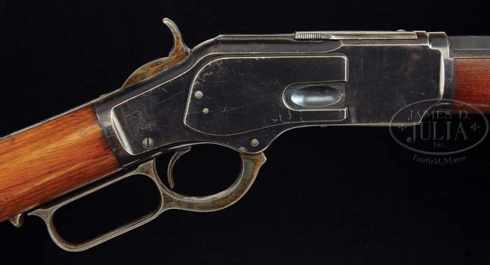 WINCHESTER 1873 STAMPED “BUREAU COUNTY” LEVER ACTION RIFLE. SN 460239. Cal. 38WCF. 24-1/4″ bbl, full mag, half nickel front sight, serrated side V-notch sporting rear with set screw, usual bbl markings with the addition of hand stamp “BUREAU COUNTY” on top flat about 10″ from muzzle. Standard 3rd Model receiver mounted with straight grain walnut, straight grip, crescent steel buttplate with trapdoor, standard forend with nose cap. PROVENANCE: Ted Knee Collection. CONDITION: Very fine. Bbl retains 95% orig blue silvering at sharp edges, a few tiny handling marks and a couple of spots of surface oxidation. Mag tube retains 90% orig thinning blue mixing with silver and brown patina. Receiver retains 95% orig blue silvering on sharp edges, thinning and blending with brown patina with some typical shallow nicks and scratches. Hammer shows dark orig case colors, slightly bright at sharp edge. Lever retains strong orig case colors on side, thinning and blending with silver patina on bottom. Stock is sound, some usual minor nicks and dings, small sliver missing on left side of top tang, a small amount of darkening from oil, some grain cracking at buttplate and retains most of its orig finish. Buttplate retains good orig color with some minor surface pitting at heel and blending with gray patina. Forend is sound with a shallow gouge; center right side, a few shallow nicks and dings, retains orig finish blending with hand worn patina. Mechanics are crisp with a nice shiny bore. 4-36528 BDT319 (5,000-8,000)