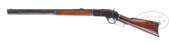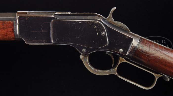 WINCHESTER 1873 LEVER ACTION RIFLE. SN 472885. Cal. 44-40. 24-1/4 oct bbl, full mag, half-nickel front sight, serrated side V-notch sporting rear with set screw. 3rd Model receiver mounted with straight grain walnut, straight grip, crescent steel buttplate with trapdoor, standard forend with nose cap. Accompanied with Cody Firearm Museum fact sheet identifying as 44 cal. rifle, oct bbl, plain trigger, received in warehouse 3/10/1884 and shipped from warehouse 6/7/1884 on order no. 14872. CONDITION: Very fine. Bbl retains 90% thinning orig blue, minor muzzle wear, bright on sharp edges, normal minor nicks and dings. Receiver retains 95% orig blue thinning on sharp edges and across top blending with brown patina, normal nicks and scratches. Hammer shows dark orig case colors. Lever shows orig case colors on side blending with gray patina across bottom. Stock is sound with normal nicks and dings, minor crack near toe on right side and retains orig finish blending with hand worn patina. Forend is sound with nicks, dings and some shallow bruises, slightly dark at receiver and retains orig finish blending with hand worn patina. Mechanics are crisp with a bright shiny bore. 4-38780 BDT317 (5,500-10,500)