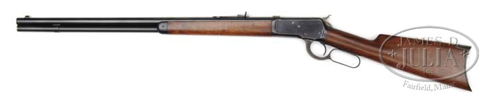 VERY FINE, FIRST YEAR OF PRODUCTION, WINCHESTER MODEL 1892 RIFLE. SN 15350. (1892) Cal. 44-40. Standard rifle, with round barrel, full magazine, and crescent butt, has nicely figured American walnut buttstock and matching forearm. PROVENANCE: Wes Adams Estate Collection. CONDITION: Excellent. Bbl and magazine tube retain nearly all of their blued finish, browned somewhat, mostly toward muzzle. Action shows some slight flaking and edge wear. Top of breechblock shows some light freckling, with a little more on extractor. Lever and hammer retain 60 – 70% orig case hardening color. Unnumbered buttplate color is very strong, wood a bit proud. Tang screw shows use. Bore is excellent, bright and shiny throughout. 4-44612 MGM340 (5,000-9,000)
