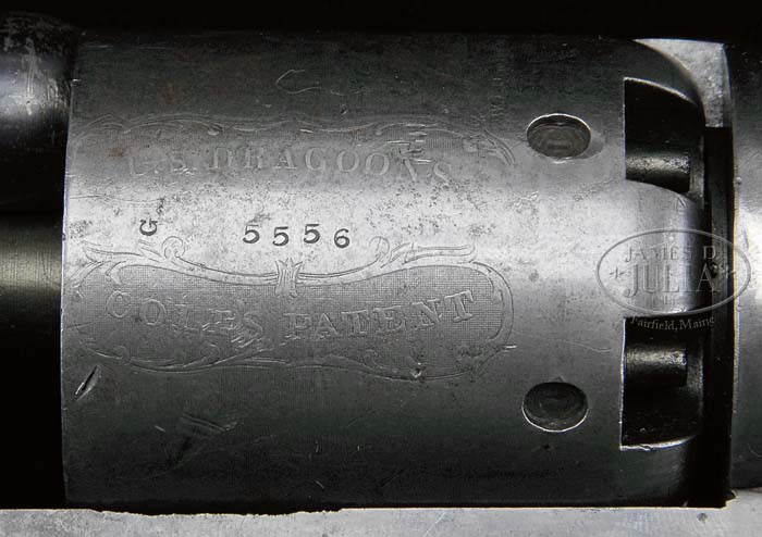 MARTIALLY MARKED COLT 1ST MODEL DRAGOON PERCUSSION REVOLVER. SN 5556. Cal. 44. Fine 1st Model Dragoon with 7-1/2″ oct to rnd bbl, worn German silver front sight and 1-line left hand address on top flat. Left side of frame is marked “COLTS PATENT” over a tiny “U.S.” Cyl is usual 6-shots with Dragoon/Indian fight scene roll marking and the “U.S. DRAGOONS / COLTS PATENT” legends. It has oval stop notches and the sgl safety pin is prominent & serviceable. The square back brass trigger guard and back strap contain a field replacement 1-pc walnut grip that is without cartouches or a number in back strap channel. SN was observed on cyl, bbl lug, frame, trigger guard & back strap with the last three digits of SN on rammer handle & cyl spindle. Wedge, a replacement, has the 3-digit number “269”. There are small inspector initials on various parts including frame, trigger guard, back strap, hammer, cyl, rammer handle & bbl lug. Bbl is full length but shows an area of heavy holter wear on left top edge of muzzle. There were approx. 7,000 of these scarce revolvers produced in the period 1848 to about 1850. They were virtually all issued and saw hard service on the American frontier and Civil War. After the Civil War they were sold as surplus with a large number of them returning to service on the frontier, in Mexico and other foreign countries where maintenance was minimal at best and in some cases non-existent. That is why they are rarely found in orig configuration with any orig finish. CONDITION: Fine to very fine, all matching except wedge & grip as noted. Bbl retains 20-30% orig blue, mostly on the bbl lug & in sheltered areas with balance flaked & worn to a metal patina. Rammer pivot retains dark case colors on left side, smoky case colors on right side with handle turned silver. Frame & hammer retain smoky case colors being mostly a light gray metal patina. Cyl is a matching metal patina with a few light nicks and retains about 70-75% Ranger/Indian fight scene with fully legible central legends and its prominent safety pin. Grip frame is a light to medium mustard patina with a few minor nicks & scratches. Grip has chipped toes with moderate edge wear and retains a hand worn patina. Mechanics are fine, bright shiny bore with a couple of small spots of pitting. 4-36673 JR40 (20,000-30,000)