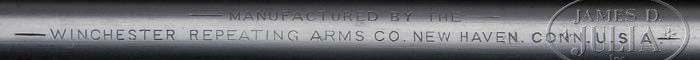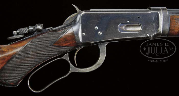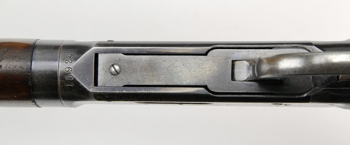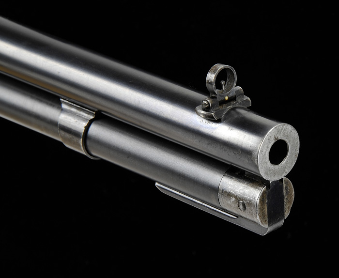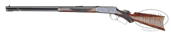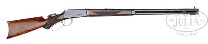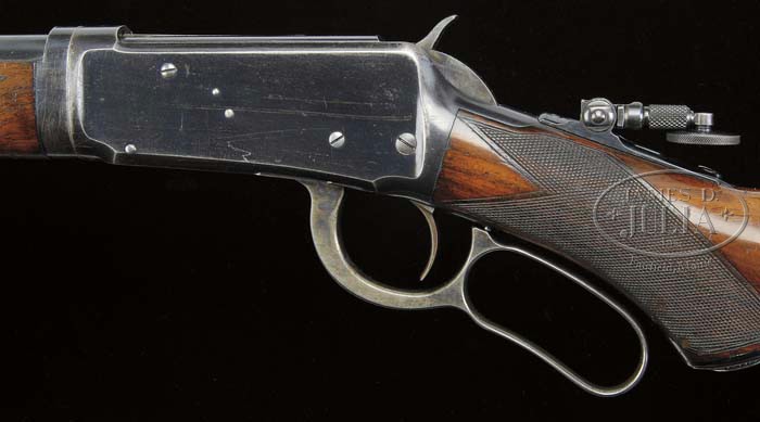 RARE ANTIQUE DELUXE WINCHESTER MODEL 1894 TWO BARREL SET. SN 15924. Cal. 30 WCF & 38-55. First bbl 26″ rnd, full mag takedown, combination front sight, Winchester 3-leaf express rear sight. Second bbl, 26″ rnd, full mag takedown, combination front sight missing globe, serrated side, sporting rear sight with set screw. Both bbls are marked on top “MANUFACTURED BY THE/WINCHESTER REPEATING ARMS CO. NEW HAVEN. CONN. U.S.A.” with caliber stamping adjacent takedown ring. Standard takedown receiver, top tang equipped with folding peep sight with large disk. Mounted with highly figured walnut, checkered pistol grip, Winchester hard rubber grip cap, steel crescent buttplate, “H” style checkered forend with nosecap. Accompanied with Cody Firearms Museum Winchester letter identifying as 38-55 cal. takedown rifle, rnd bbl, plain trigger, checkered stock with pistol grip, sights: Lyman rear combination with cup disk and Lyman combination front, interchangeable: 38-55 cal. rnd bbl, 26″ takedown, bbl and mag with fancy checkered forearm and Lyman combination front. Received in warehouse November 18, 1896, shipped same day on Order No. 23590. A copy of the hand written ledger clearly shows calibers as 38-55 and 30 WCF with a simple mis-print in the letter. Inspection of lower tang reveals Assembly No. 3432XXX, matching 3432 can be found back of stock as well as “94” with matching number on inside toe of buttplate. Accompanying case is two bbl Leg O mutton. CONDITION: Very good. Both bbl sets retain 95-97% orig blue with typical minor nicks & scratches and rub mark from takedown on mag tube. Receiver and takedown rings retain 95% orig blue, silvering on sharp edges, normal minor nicks & scratches, and thinning across bottom. Hammer shows strong orig case colors, lever shows good case colors in protected case areas blending with a gray patina. Stock is sound with good checkering, some shallow nicks & scratches and slight flaking of the orig piano varnish finish. Forends are sound with good checkering, minor nicks dings & scratches, showing orig piano varnish finish with some hand worn patina. Nosecaps show flaking orig blue blending with brown patina. Mechanics are crisp, bright shiny bore in 38-55 bbl, good bore in 30 cal. with some shallow scattered pitting. Case is quite scuffed, broken & replaced straps. 4-40286 BDT55 (20,000-30,000)