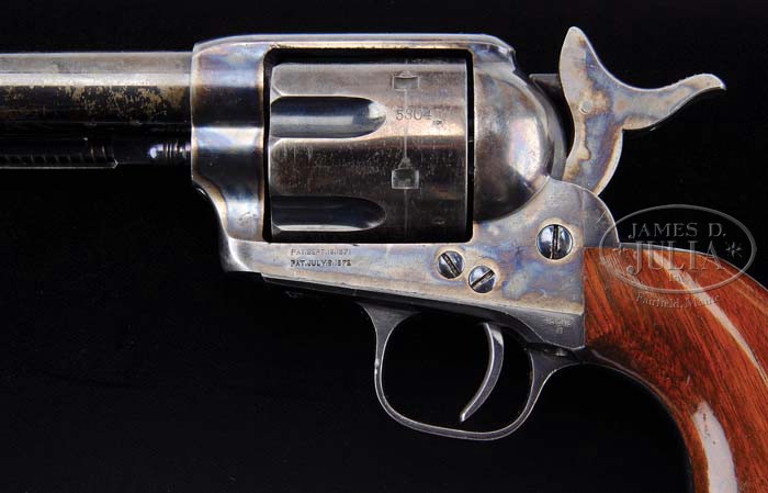 RARE VON OPPEN COLT SINGLE ACTION ARMY REVOLVER. SN 15304. Cal. 45 Boxer (45 Eley Short). Blue & case colored with 5-1/2″ bbl, full front sight with script letter address that has serifs at each end. Bottom of bbl has last four digits of serial number under ejector rod housing. Ejector rod housing is 1st type with bull’s eye ejector rod head. Bottom left side of bbl and cylinder have tiny British proofs. Left side of frame has 2-line patent dates and left shoulder of trigger guard is marked “45 CAL / B”. Mounted with nicely figured walnut 1-pc grip that has last four digits of serial number in back strap channel. Right shoulder of trigger guard has the Von Oppen stamp which consists of a rampant Colt surmounted by a “C”. Baron Frederick Von Oppen was Samuel Colt’s brother-in-law and was the head of Colt’s London Agency and Sales Agent for all of Europe, the middle and near East. This mark was established by Von Oppen with the concurrence of Samuel Colt which was used as an additional mark to certify Colt originality as early as 1872 and was applied to Colt firearms that were not clearly marked with the Colt address, especially those in the 450 Boxer and 450 Eley calibers. These Von Oppen marked single actions are rarely encountered today with only a few known. Accompanied by a Colt factory letter identifying this revolver with blue finish in caliber “45 ELEY SHORT” with bbl length and type of stocks not listed, shipped to Colt’s London Agency, 14 Pall Mall, London, England on Nov. 5, 1874 in a shipment of 100 same type guns. This SAA was manufactured in 1874 which was the first year of production for the 450 Boxer caliber and also the first year the 5-1/2″ bbl was available. CONDITION: Extremely fine, all matching including grip. Bbl retains 75-80% glossy original blue with the flaked areas a medium patina. Frame & hammer retain virtually all of their brilliant original factory case hardened colors, slightly thinned on recoil shield and loading gate with some minor fading on top strap and top edge of hammer. Sides of frame are brilliant. Cylinder retains about 75% thinning orig blue, strong & bright in the flutes. Trigger guard and back strap retain most of their orig glossy bright blue, slightly thinned on front strap with heavier thinning on back strap toward heel. Grip is sound with minor handling & use marks, a couple of small gouges and a heavy scratch on right side and overall retains most of its brilliant orig varnish. Mechanics are crisp, bright shiny bore. 4-38593 JR7 (28,500-32,500)