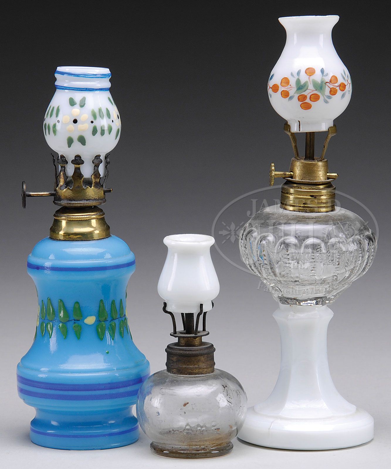 THREE MINIATURE LAMPS. 1) S1-11R. White milk glass pedestal base with clear pressed glass font; Olmstead burner and white milk glass shade with painted floral decor. 2) S1-15. Clear glass Little Harry font with white milk glass shade; Olmstead burner. 3) Floral decorated blue milk glass base with foreign burner and white milk glass Vapo Cresolene shade painted to match. SIZE: 7″, 3″ and 6-1/4″ t respectively. CONDITION: 1) Generally good. 2) Very good to excellent. 3) Very good to excellent. 5-65062, 5-65109 (200-300)