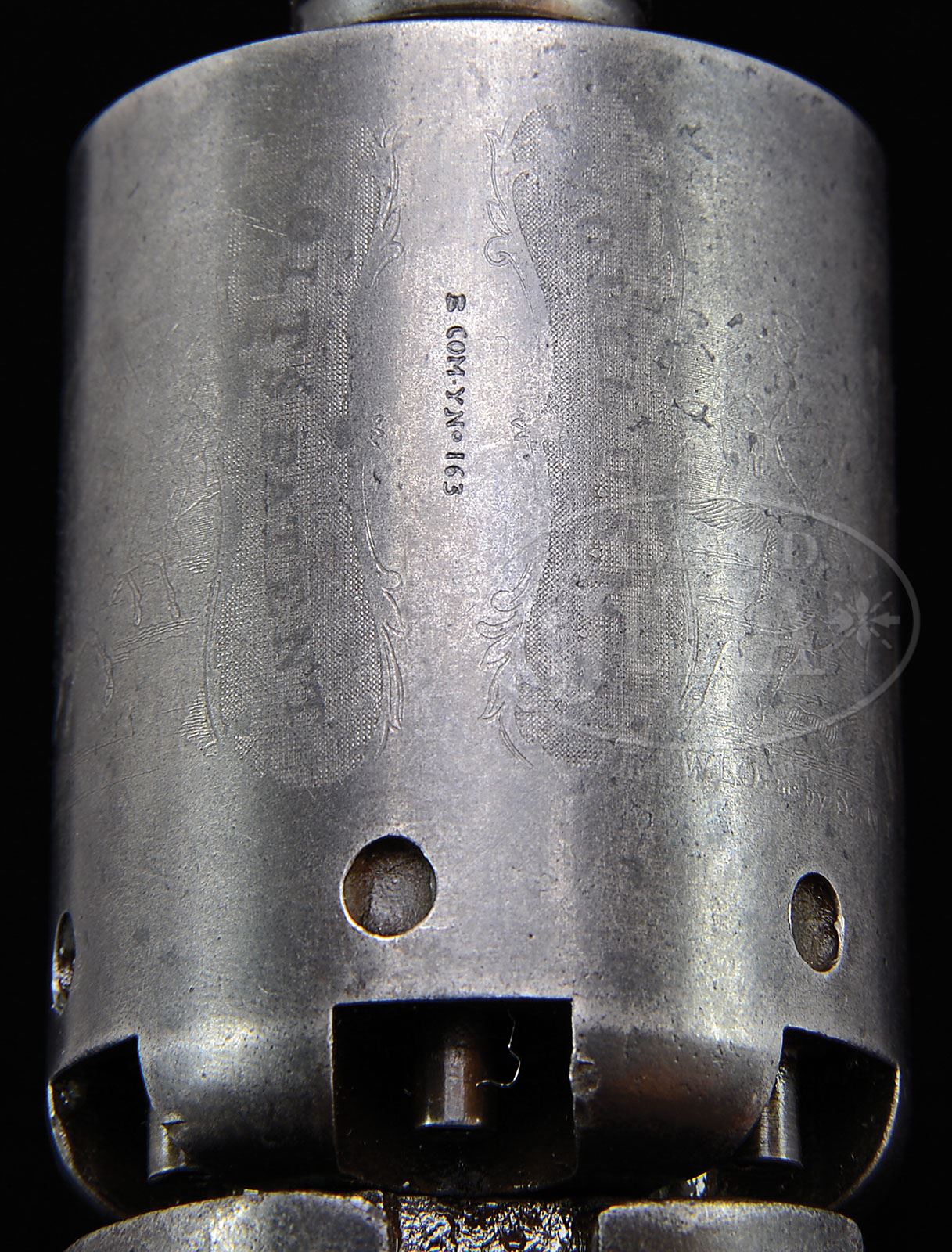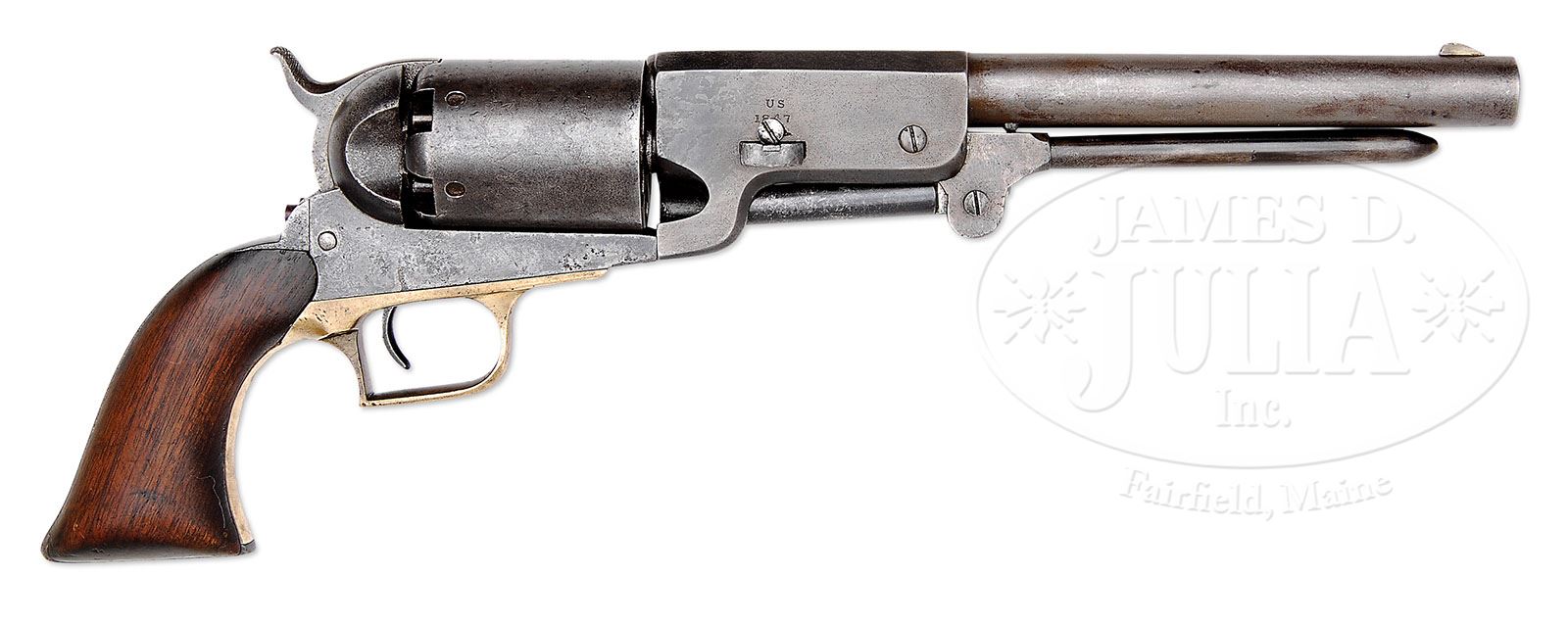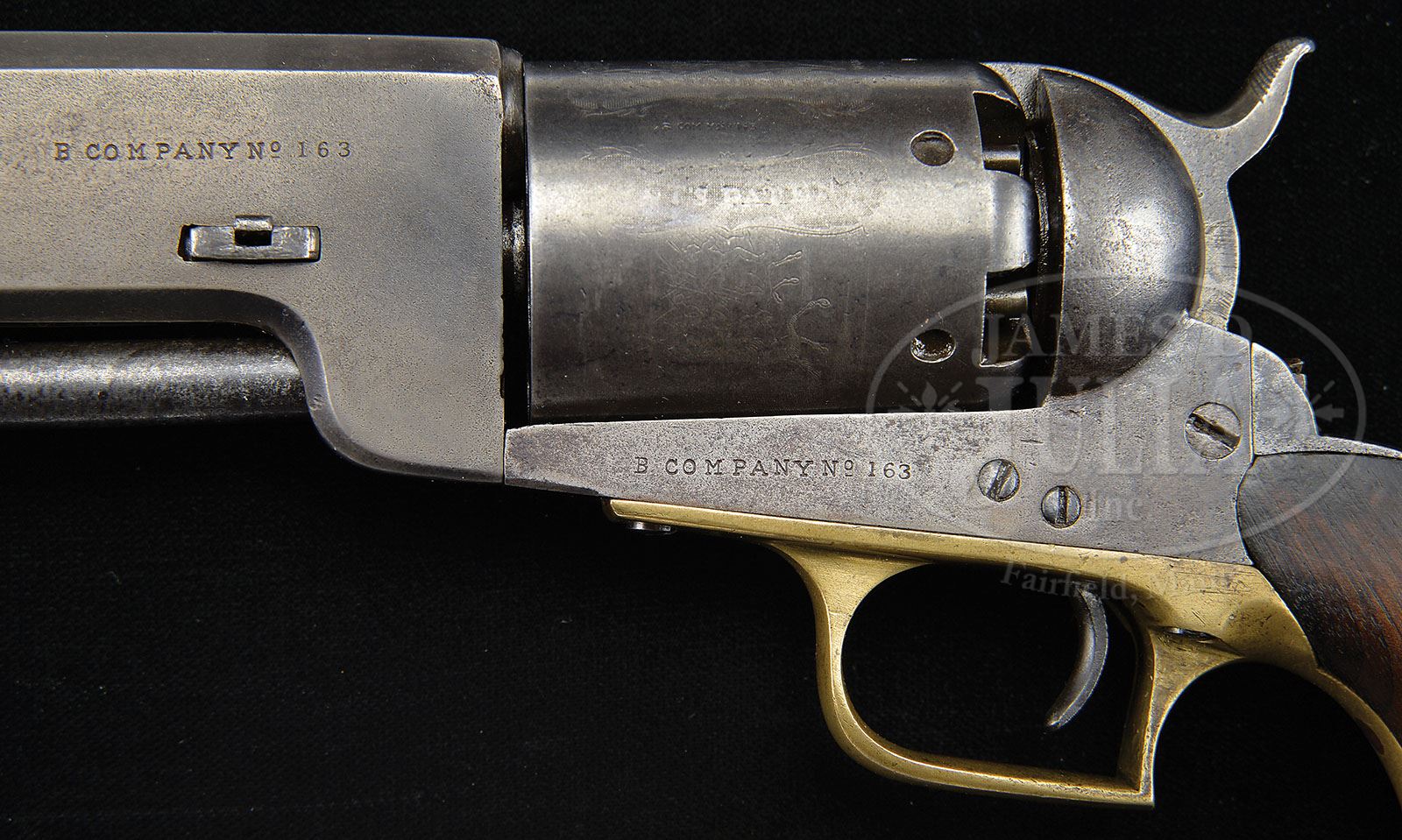 RARE COLT WALKER PERCUSSION REVOLVER. SN B COMPANY 163. Cal. 44. Usual configuration with 9″ oct to rnd bbl, German silver front sight and 1-line left hand New York City address. Left side of bbl lug is marked with SN and the right side “US / 1847”. Left side of frame & buttstrap are also marked with the full SN. Bbl lug & frame SNs appear to have been recut some time in the past. Trigger guard & cyl are marked “B COMY NO 163”. Cylinder is usual 6-shots with oval stop notches and the Dragoon/Indian fight scene roll marking. Cyl also has the legible “MODEL U.S.M.R.” and “COLT’S PATENT” panels surrounding the SN. Rear face of cyl retains its one orig serviceable safety pin. Cyl may be an old replacement. Left side of front strap, under the grip, is marked “163”, which number is also found on bottom of cyl arbor and inside the toe of the grip. Wedge is a period of use replacement bearing the number “29”. It appears that the rammer handle has been repaired and rammer latch spring is a replacement, along with a couple of miscellaneous screws, however most screws are original. This revolver was part of the famous William M. Locke Collection and is pictured as the bottom revolver on p. 43 of the book, The William M. Locke Collection, Sellers. It was also offered for sale by Great Guns Inc. of Durham, NC in an ad in the July 1980 edition of The Gun Report, a copy of which page accompanies this revolver. As is well known, only 1,000 martially marked Colt Walker revolvers were produced in 1847 to arm American troops fighting in Mexico. These revolvers were designed by Samuel Colt at the persistent instigation of Texas Ranger, Capt. Samuel H. Walker, for whom the model was named. For his help Colt presented Capt. Walker with a pair of civilian Walkers which were with Capt. Walker when he was killed at Humantla, Mexico on Oct. 9, 1847. It is well recorded that only 500 of the orig 1,000 Walkers were ever issued to troops in Mexico. Apparently the other 500 arrived after the cessation of hostilities and were never issued in Mexico. All of the issued Walkers were to have been returned by the troops upon embarkation from Mexico, although it is speculated that a few were retained by some of the troops and others lost in battle. So it is unclear just exactly how many did return to the U.S. where they were stored at San Antonio Arsenal, Texas. Some of those revolvers in Texas were issued to Texas Rangers and frontier troops where they saw extensive and hard service. Most of these Walkers remained at San Antonio until the outset of the Civil War when they were confiscated by the Confederacy and it is believed they were issued to Texas Cavalry troops, again seeing hard service under adverse conditions with very little maintenance. It is extremely rare to find a completely orig Walker with any orig finish or cyl scene roll marking. PROVENANCE: William M. Locke Collection CONDITION: Fine with old restored finish, all matching except wedge as noted. No orig finish remains, being an overall smooth gray brown patina with very fine pinprick pitting; rammer handle repaired as noted & latch spring replaced as noted; cyl is a matching patina with a few scattered spots of pitting and shows 50-60% Dragoon/Indian fight scene with the Ormsby signature still visible and the two panels surrounding the SN completely legible; the finish on the cyl may be slightly enhanced; trigger guard is a medium mustard patina and the backstrap an artificially aged blue/brown patina; frame is a matching patina with fine pitting and lightly enhanced finish. Grip is sound showing heavy wear with a dark hand worn patina. Mechanics are fine, strong bright bore with light frosting. 4-47559 (85,000-95,000)