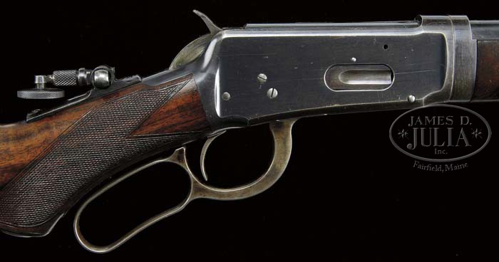 WINCHESTER MODEL 1894 DELUXE TAKEDOWN LEVER ACTION RIFLE. SN 27056. Cal. 25-35 WCF. 26″ rnd bbl, 1/2 mag takedown, dovetailed 1/2 nickel front site, Winchester 3-leaf express rear sight. Top of bbl marked “MANUFACTURED BY THE/WINCHESTER REPEATING ARMS CO. NEW HAVEN CONN. U.S.A.” Top of bbl adjacent takedown ring “25-35 W.C.F.” Standard takedown receiver, top tang equipped with flip-up peep sight. Mounted with highly figured flame grain walnut, “H” checkered pistol grip, Winchester hard rubber grip cap, smooth steel shotgun butt, “H” checkered forend with nosecap. Accompanied with Cody Firearms Museum Winchester letter identifying as 25-35 rnd bbl rifle, plain trigger, checkered stock, pistol grip, oil finish, 1/2 mag, shotgun butt, takedown, received in warehouse October 26, 1897, shipped same day on Order No. 19158. Inspection of lower tang reveals assembly number 4544SOH matching 4544 can be found on back of stock and inside toe of buttplate. CONDITION: Fine. Bbl retains 90% orig blue with minor muzzle wear, normal minor nicks & scratches, usual mar from takedown lever and some slight thinning in chamber area. Takedown ring retains 50-60% orig blue blending with silver and brown patina. Receiver retains 80-85% orig blue thinning on sharp edges and across bottom blending with silver patina, normal minor nicks & scratches. Hammer retains orig strong case colors, lever shows good orig colors on side, blending with silver patina across bottom. Stock is sound with slightly worn checkering, some minor nicks & dings and retains a fine cleaned and refreshed oil finish. Forend is sound with slightly worn checkering, some usual light handling marks and retains an oil finish blending with hand worn patina. Nosecap retains orig blue blending with some silver patina. Mechanics are crisp with a very nice bore. 4-41004 BDT13 (7,000-10,000)