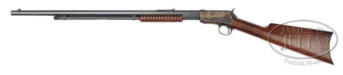 *WINCHESTER MODEL 90 CASE HARDENED ACTION. SN 71715. (1899) Cal. 22 WRF. Standard configuration. 24″ bbl is fitted with screwed-on screw elevation adjustable. Case hardened takedown action is marked “WINCHESTER Model 1890” with patent information on top tang. Bottom tang has SN. PROVENANCE: Cody Firearms Museum research letter, stating that this rifle was received in the warehouse on Sept 5 1899, shipped on Sept 9. Wes Adams Estate Collection. CONDITION: Excellent. Blued parts retain nearly all of their blue, with a few areas of cleaning of bbl toward muzzle, some slight edge wear, some flaking of magazine tube holders and breech block. Action retains 85 – 90% orig case hardening color, browned on tangs, thinned and freckled on bottom and trigger guard, a few bright marks on right side. Buttplate retains a considerable amount of its darkened case hardening color, browned considerably at heel. Stocks retain most of their orig finish, thinning at grip and on comb, with some minor dents, mostly on right side of buttstock. Bore is strong, bright and shiny, with a few minor pits. 4-44754 MGM327 (2,500-3,500)