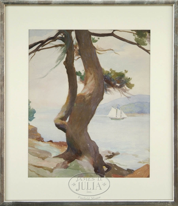 WILL ROWLAND DAVIS (American, 1879-1944) COASTAL SCENE WITH SCHOONER. Watercolor scene shows a two-mast schooner in full sail in a tranquil inlet with a large tree in foreground. Rocky shore with hills beyond. Signed lower left “Will Davis”. Housed in a fine silvered gilt modern frame with white matte. PROVENANCE: Descended through the artist’s family. SIGHT SIZE: 16-1/2” x 13-3/4”. CONDITION: Very good. 9-29169 (500-1000)
