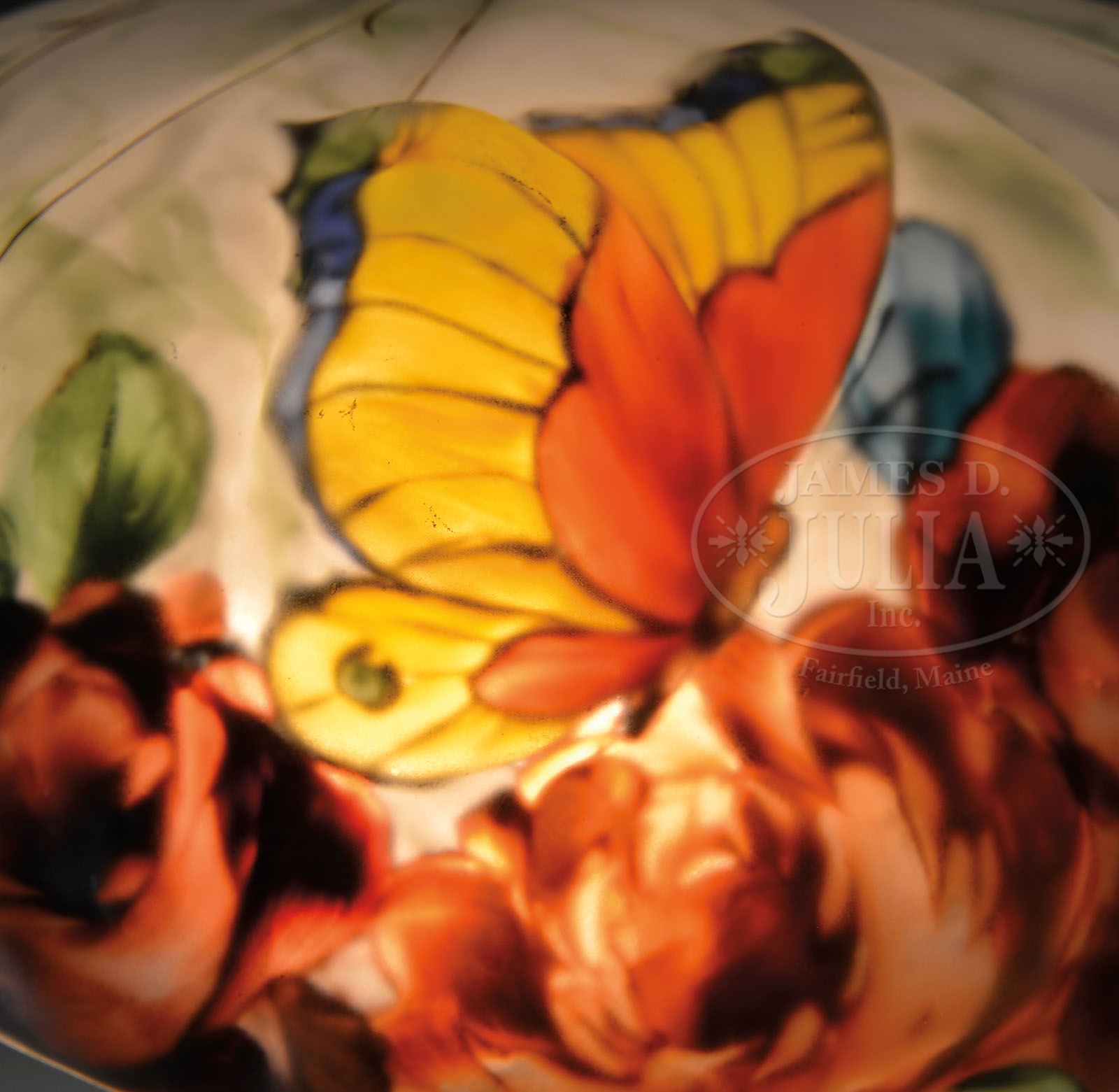 PAIRPOINT PUFFY BUTTERFLY LAMP. Pairpoint Puffy table lamp has papillon shade with red roses encircling the bottom edge of the shade with green and blue shaded leaves entwined. Each corner of the shade has a colorful butterfly above the roses. All against a white background with light green shading. The exterior of the shade is further decorated with gilded highlights. Shade rests on a square Pairpoint base with etched floral design on each side near the foot. Base has a two-socket cluster and is signed on the underside “Pairpoint Mf’g Co” along with the Pairpoint logo and “B3037”. SIZE: Shade is 14″ dia. Lamp is 21″ t. CONDITION: Very good to excellent with some wear to finish on base. 5-67670 (2,500-3,500)