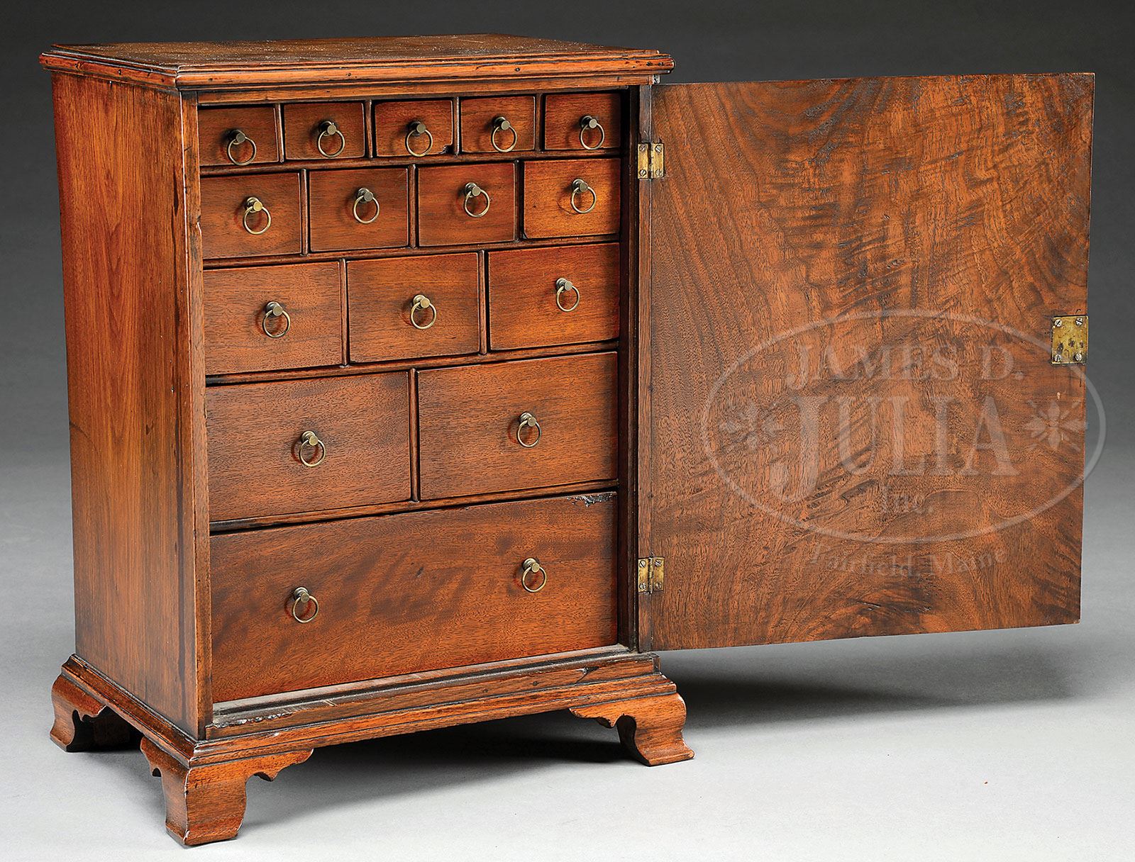 FINE PENNSYLVANIA CHIPPENDALE WALNUT SPICE CABINET. Last quarter 18th century. The rectangular cabinet with applied molding above a door of figured walnut enclosing an arrangement of five rows of small dovetailed spice drawers varying in size. Each with an original knob. The cabinet on a molded based raised on well-proportioned ogee bracket feet with shaped returns. Walnut with yellow pine secondary wood. SIZE: 21-1/4″ h x 15-1/4″ w x 12″ d. PROVENANCE: From a private Southern Maine collection. Philip H. Bradley Co. Antiques, Downingtown, Pennsylvania. CONDITION: Cabinet retains old surfaces. Professionally repolished. Bracket feet original. Very good overall. 9-29411 (5,000-7,000)