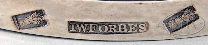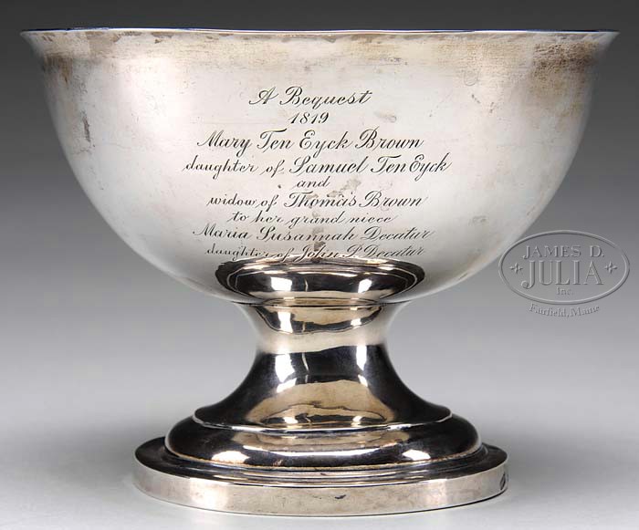 DECATUR FAMILY SILVER BAPTISMAL FOOTED BOWL. Circa 1818, made by John W. Forbes (1808-1838), New York. The deep footed bowl with everted rim on a stepped circular footed plinth with the base rim with the hallmark of “I W Forbes” (J. W. Forbes). The side of the bowl monogrammed “M B” and the date “1819”. Opposite the engraving: “A bequest / 1819 / Mary Ten Eyck Brown / Daughter of Samuel Ten Eyck / and / widow of Thomas Brown / to her grand niece / Maria Susannah Decatur / daughter of John P. Decatur”. WEIGHT: 12 tr. oz. SIZE: 4-3/4″ h x 6-1/4″ d PROVENANCE: By descent through the Stephen Decatur family. A page within the handwritten notebook of personal property is #5 “Baptismal Bowl 1819 maker I.W. Forbes for John W. Forbes. All my great grandfather Decatur’s generation were baptized with this bowl.” CONDITION: Very good overall with expected shallow dents and scratches from normal usage. 9-97923 (1,000-2,000)