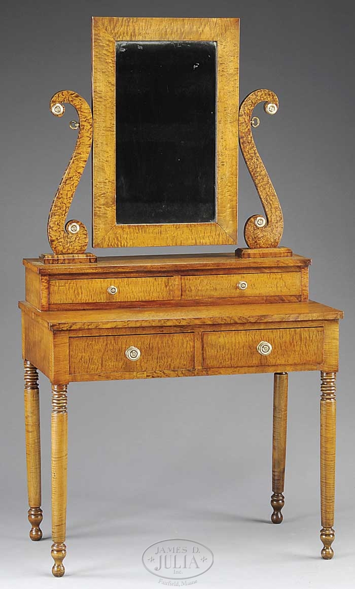 NEW ENGLAND SHERATON FIGURED MAPLE DRESSING TABLE. The circa 1840 rectangular mirror plate within a conforming frame joined to and swiveling on S-scrolled supports joined to the raised deck fitted with a pair of aligned short drawers stepped back of the conforming rectangular case also fitted with a pair of aligned fitted short drawers raised on tapered cylindrical ring-turned legs terminating in ball feet. The whole constructed of bold figured maple. SIZE: 56″ overall h, 34-3/4″ w x 20-3/4″ d. CONDITION: Professionally repolished and restored. In very good condition overall. The hardware later custom replacements. 9-20064 (2,000-3,000)