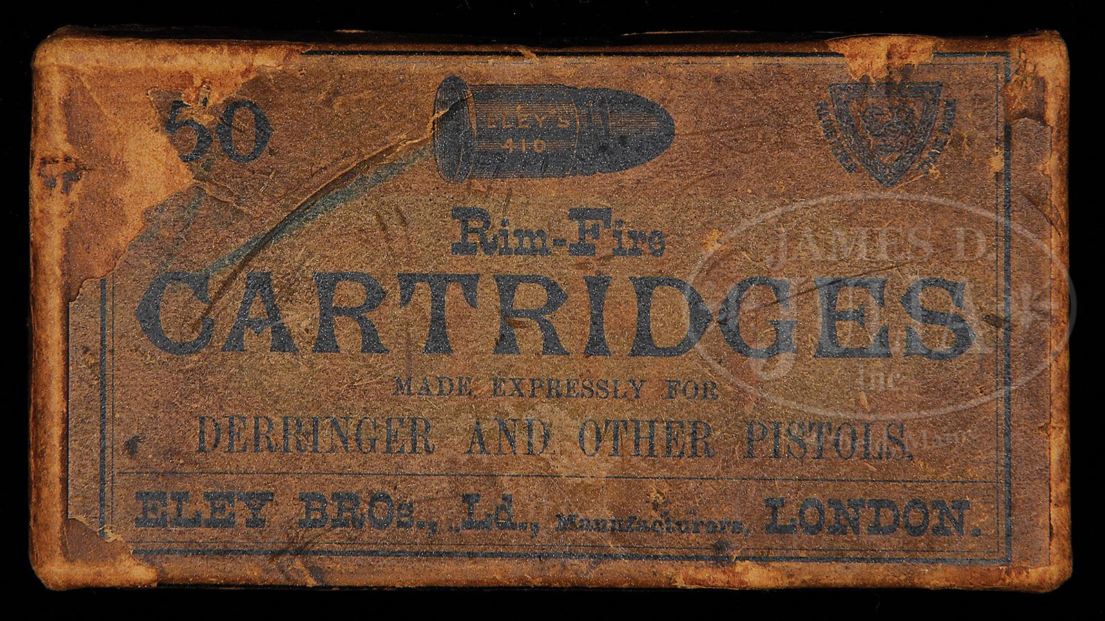 FULL BOX OF 50 ELEY BROS. LDT, MANUFACTURERS, LONDON .41 SHORT RF CARTRIDGES. Cal. .410/.41. Top label is marked “made expressly for Derringers and other pistols”. PROVENANCE: C.W. Slagle, L.D. Eberhart Collection. CONDITION: This brown carton has part of the top label missing at left top, but all writing is clear and legible. Some scrapes from age and some soiling on bottom and edges. Considered to be a rare box of cartridges which is opened, but full. 4-47492 DE112 (700-1,000)