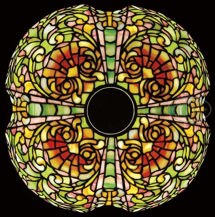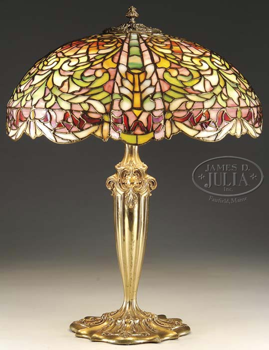 DUFFNER & KIMBERLY LOUIS XV LEADED TABLE LAMP. Absolutely stunning table lamp is leaded in a tapestry pattern comprising every shade of pastel glass imaginable from yellows to greens to pink to rose. Leaded with four large curved panels each has a large center medallion of green glass set against a soft pink hue. The four larger panels are further decorated with an Art Nouveau owl face in colors of cream and yellow. These four larger panels are separated by ornate banding in gold. Shade is supported by its original style base having the same bright gold as the bronze work on the shade. This base is complete with four original sockets, pull chains, top cap and finial. Base is properly signed “Duffner & Kimberly Co. New York” and has “DKC” logo as well. Shade is unsigned. SIZE: Shade is 18″ dia. Lamp 22″ t. CONDITION: Lamp is very good to excellent with very few tight hairlines having no missing glass in the shade. Base has minor wear to bright gold finish commensurate with age. 5-64294 (30,000-40,000)