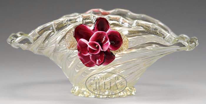 ITALIAN ART GLASS BOWL. Lovely Venetian bowl has clear glass swirl design with gold flecks throughout the body of the bowl. The bowl has rolled sides and each side is decorated with an applied maroon colored glass flower and clear gold flecked leaves. SIZE: 12″ l x 5-1/4″ t. CONDITION: Very good to excellent. 5-69038 (200-400)