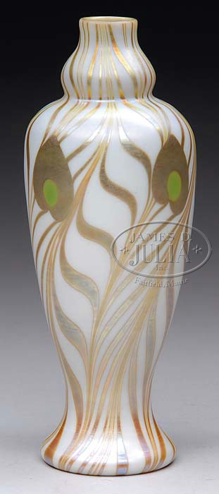 STEUBEN PEACOCK EYE VASE. Iridescent gold aurene pulled feather decoration with four green peacock eyes on a calcite ground. Signed on the underside “Aurene 269”. SIZE: 9-3/4″ t. CONDITION: Very good to excellent with very minor surface scratches to decoration. 8-76252 (7,000-10,000)