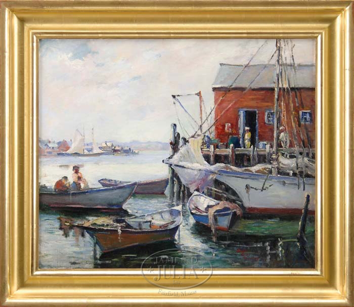 JESSIE GARY BRADLEY (American, 20th Century) AFTERNOON AT THE HARBOR. Oil on canvas scene shows figures, boats and fish houses. Signed mid lower right. Housed in a contemporary gilt frame. SIZE: 20” x 24”. CONDITION: Very good to excellent. 9-71888 (2,500-3,500)