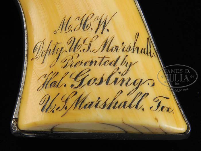 COLT SINGLE ACTION ARMY REVOLVER WITH PRESENTATION FROM A TEXAS U.S. MARSHALL. SN 84857. Cal. 45 Colt. Nickel finish with bbl reduced to 4-15/16″ from either 5-1/2″ or 7-1/2″. Bbl appears to have been cut professionally with a slightly beveled edge and chamfered bore. The sight, however, was not relocated. Fitted with third type ejector rod housing with tapered half moon ejector rod head. Left side of frame has 3-line patent dates and has the caliber marking on left front web of trigger guard. Grip frame is mounted with a 1-pc smooth ivory grip constructed of two slabs of ivory glued to a split wooden block and is probably orig equipment as supplied by a distributor. Left grip is inscribed in beautiful period script “M.H.W / Deputy U.S. Marshall / Presented by / Hal. Gosling / U.S. Marshall, Tex.”. As of this writing the identity of M.H.W. is unknown but apparently was the deputy to Marshall Hal Gosling. Research through the U.S. Marshall Service would surely disclose this individual’s name and record. In the book Encyclopedia of Western Lawmen & Outlaws, Nash, p. 141 states that Harold L. Gosling (1853-1885) was from Shelbyville, TN, had attended Annapolis Naval Academy, studied law in Washington and owned a newspaper in Medina County, Texas. He was appointed U.S. Marshall for the Western District of Texas in 1884 and on Saturday, Feb. 21, 1885, while transporting James Potts & Charles Yeager from Austin to San Antonio, was killed in the line of duty near New Braunfels, TX. Accompanied by a Colt factory letter identifying this revolver in caliber 45 Colt, bbl length not listed, nickel finish, type of stocks not listed and shipped to Simmons Hardware Co., St. Louis, MO on Dec. 26, 1882 in a shipment of 25 same type guns. Simmons Hardware was a major distributor for the Western United States for Colt firearms. Also accompanied by a large packet of information regarding the loan of this revolver to the Smithsonian Traveling Exhibition Service for the period 1988-1991. It appeared in the exhibition of “America’s Star, the U.S. Marshalls, 1789-1989”. It was returned to the then owner, Mitch Luksich, in Aug. 1991. Additionally accompanied by what is probably the orig holster for this revolver. It is described as a Mexican brass & silver wire embroidered dbl loop holster with thumb tab & brass stud with braided laced rear edge. This holster is typical of the workmanship of that time and location. PROVENANCE: Mitch Luksich. CONDITION: Very good to fine. Overall retains 85-90% milky orig nickel with fine pimpling on frame & hammer and some minor losses on ejector rod housing, front strap, butt strap & back strap. Cylinder retains strong orig nickel with some flaking that has turned to dark patina. Grip is slightly shrunken but fits fine and retains a wonderful mellow ivory patina with clear inscription that shows fine hand wear. Hammer is not solid in safety or half cock notches, otherwise mechanics are fine. Strong bore with good shine & fine pitting. Holster is dry & fragile and in need of treatment, with loop rivets having rusted and pulled through the skirt and now are hand stitched in place. Some of silver embroidery is starting to accumulate verdigris. 4-39681 JR155 (9,500-12,500)