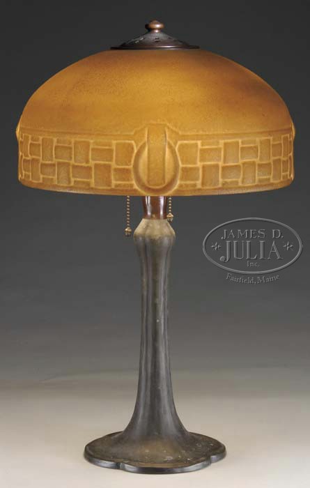 HANDEL ARTS & CRAFTS TABLE LAMP. Brown Mosserine exterior is decorated with an Arts & Crafts design to border. Shade is finished with a white cased interior. The lamp is finished with a three socket base of simple Mission styling completed with acorn pulls, pierced top cap and finial. Shade is signed in the ring “Handel” also signed on the interior “U.S. Patents” with numbers and brown “Handel 5635”. Base is signed “Handel” on underside. SIZE: Shade is 14″ dia. Lamp is 23″ t. CONDITION: Shade is very good to excellent. Base shows wear to finish. 5-61467 (1,500-2,500)
