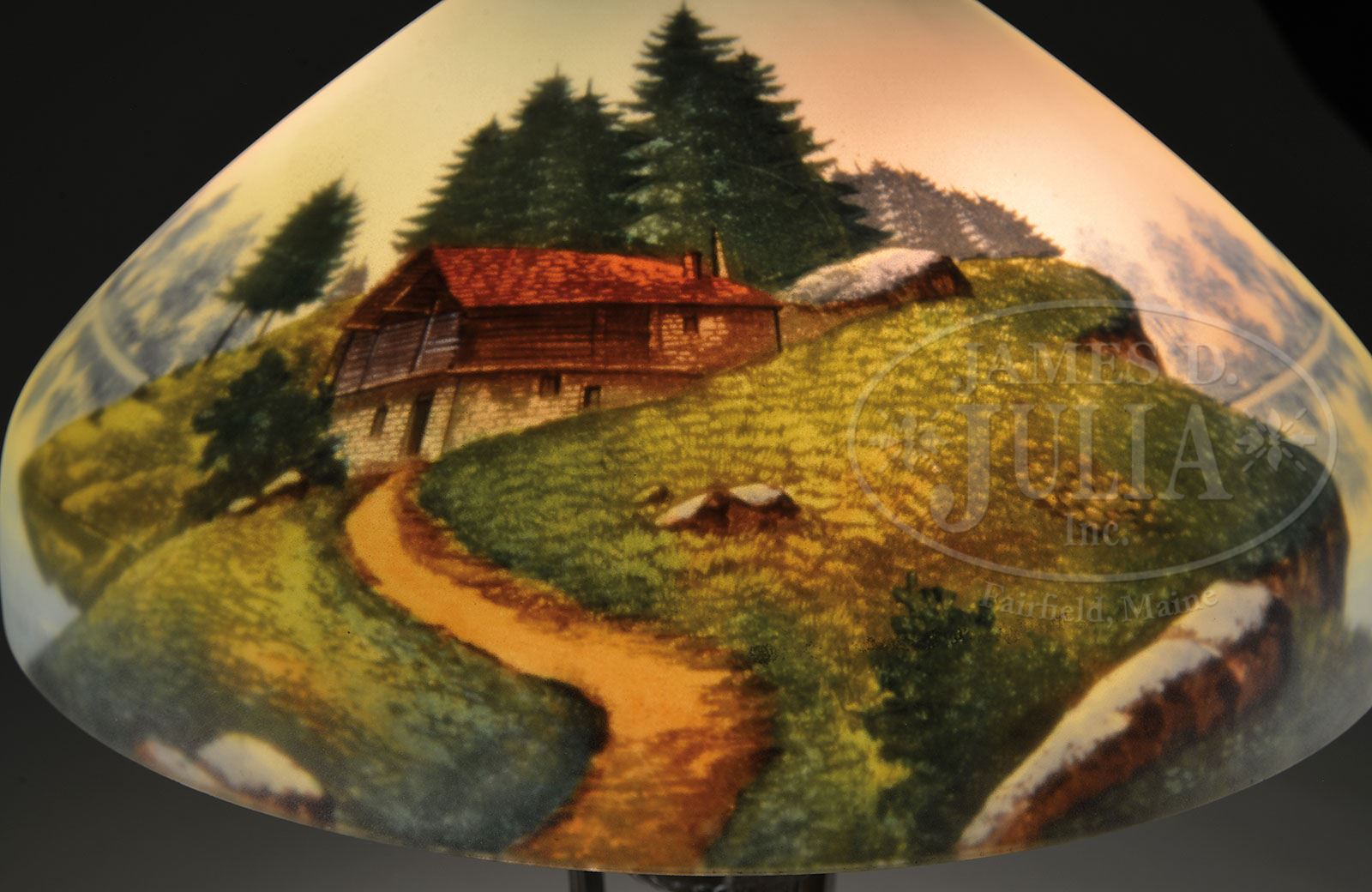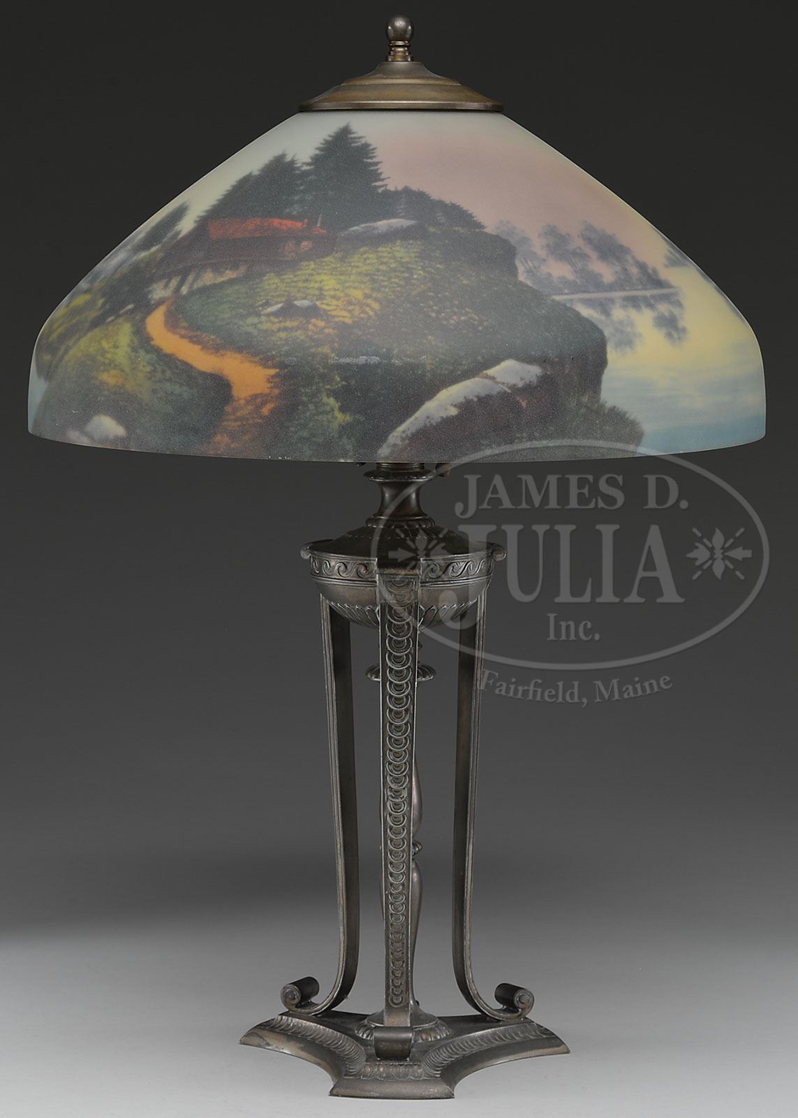 REVERSE PAINTED TABLE LAMP. Reverse painted Phoenix shade has country home sitting on the banks of a lake. The pattern repeats itself on front and back. The shade rests on a Pairpoint base with three legs supporting a center column and resting on a curved three prong platform. Base is signed on the underside “Pairpoint” along with the Pairpoint logo “D3070”. SIZE: Shade is 15-3/4″ dia. Lamp is 23″ t. CONDITION: Shade has minor roughness to aperture. Base has wear to finish. 5-67699 (600-900)