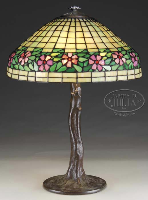 HANDEL LAMP WITH LEADED SHADE. Bent tree trunk base carries a highly desirable chocolate brown patina finish and is completed with three sockets, acorn pulls, pierced top cap and floral finial. This base supports a replica leaded shade with soft green geometric panels to background with six petal pink flowers with red centers and green foliage. Base is signed with a “Handel” felt label. SIZE: Shade is 17″ dia. Lamp is 23″ t. CONDITION: Very good to excellent with base having a replacement finial. 5-61456 (1,000-1,500)