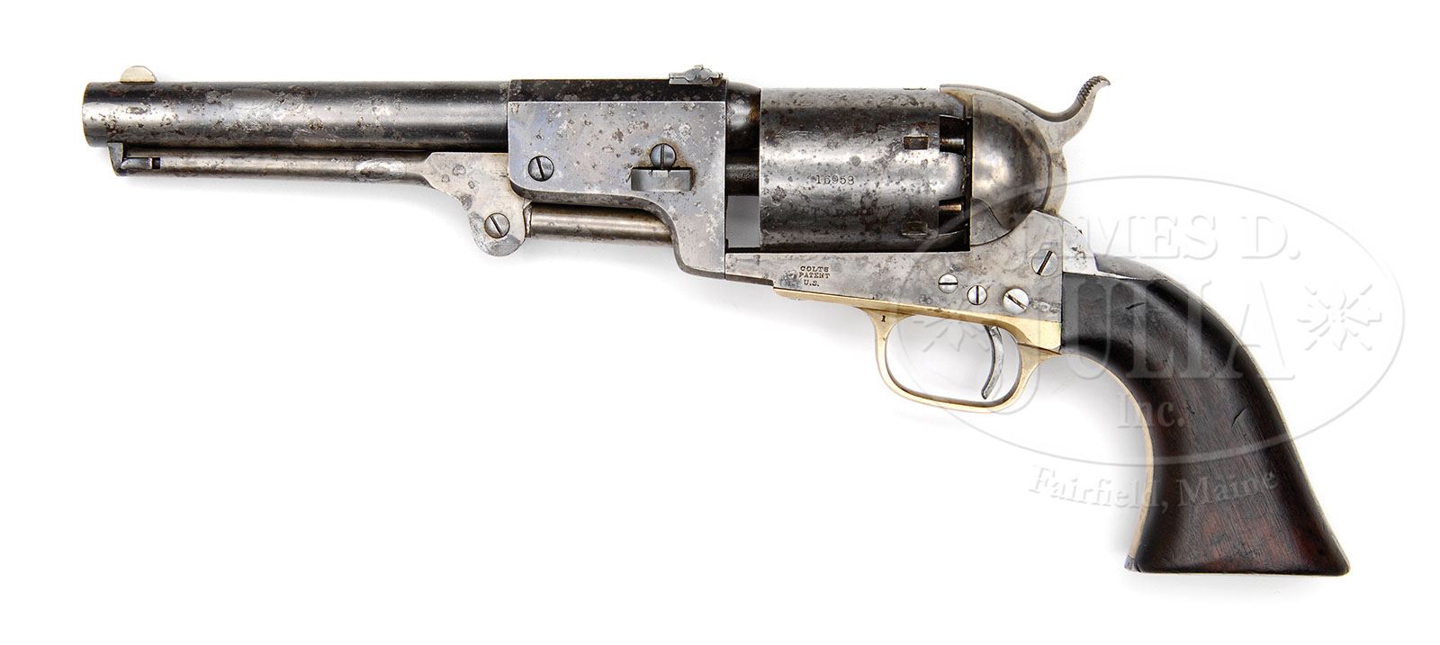 COLT 3RD MODEL DRAGOON PERCUSSION REVOLVER. SN 16958. Cal. 44. Blue & color case hardened with 7-1/2″ oct to rnd bbl, German silver front sight and 1-line New York City address. Top flat of bbl lug contains a dovetailed 2-leaf, 3-position sight. Frame is 4-screw style cut for shoulder stock with flat head hammer screw and extended stock yoke screws. Left side of frame is marked “COLTS PATENT” over a tiny “U.S.” The brass trigger guard and iron back strap contain an oil finished 1-pc walnut grip whose backstrap channel is dark oil stained making any numbers illegible. Left side of grip has a partially legible “JCB” (Joseph C. Bragg) cartouche and the right side a completely legible “WAT” (William A. Thornton) cartouche and there are small inspector initials on the various other parts. Cyl is in the white, never having been originally blued and has the dragoon/Indian fight scene roll marking. All six safety pins are crisp & serviceable. This revolver appears to be new & unfired but has several areas of pitting reminiscent of blood pitting or possibly having been stored in a leather holster for an extended period in very damp circumstances. PROVENANCE: Floyd Everhart (1981); Robert Howard Estate Collection. CONDITION: Fine, all matching including wedge & cyl, grip as noted above. Bbl retains 60-70% thin orig blue with the aforementioned pitting. Rammer handle retains faded case colors with pitting. Frame & hammer retain most of their orig faded case colors with scattered small spots of pitting. Cyl retains its orig bright finish with areas of pitting and overall retains 65-75% dragoon/Indian fight scene. The “MODEL U.S.M.R.” and “COLT’S PATENT” legends are mostly legible. Chambers of cyl are bright and clean and appear unfired. Trigger guard, which was never silver plated, is a medium mustard patina. Backstrap retains traces of thin blue with several areas of pitting. Grip shows moderate to heavy wear with slightly chipped toes & heels and has several dings & bruises and is probably not orig to this revolver. Mechanics are crisp, brilliant shiny bore. 4-47554 (6,000-10,000)