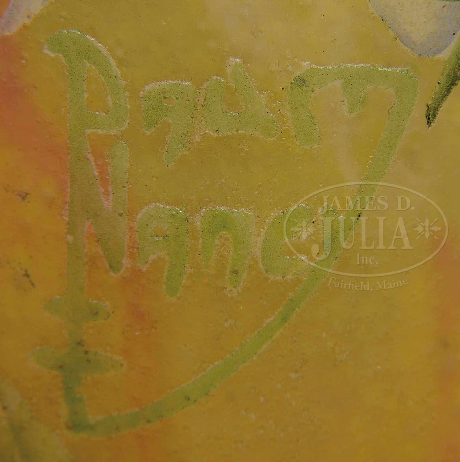 Estimate is incorrect in catalog. Estimate should read 3,000-5,000. DAUM CAMEO & ENAMEL VASE. Daum vase has beautiful cameo and enameled apple blossoms with shaded green leaves and brown stems against a mottled orange to yellow background. Signed on the side in cameo “Daum Nancy” with cross of Lorraine. SIZE: 7″ t. CONDITION: Very good to excellent. 5-68151 (3,000-5,000)