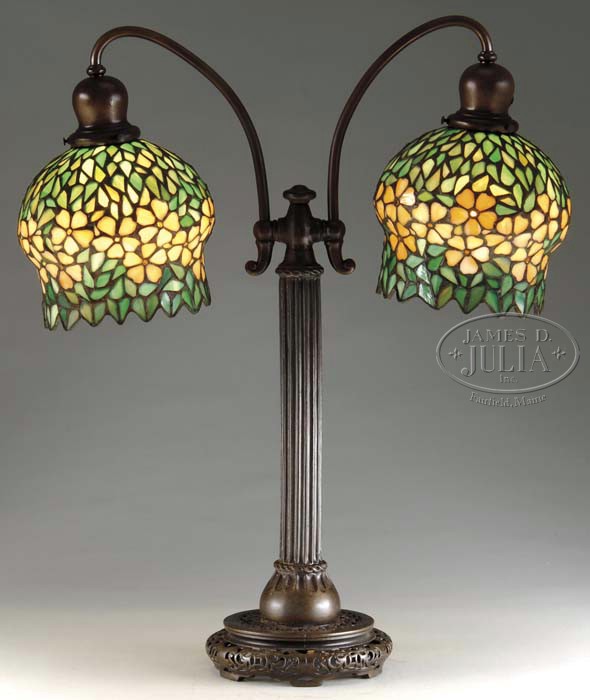 HANDEL DOUBLE STUDENT LAMP. Very unusual Handel double student lamp features two leaded shades with a band of yellow flowers against a leaf green background. Shades are supported by a Handel double student lamp base with pierced foot, vertically fluted stem and gently curving goose neck arms leading to shade caps. Base is finished in a dark brown patina. Unsigned. SIZE: Shades are 7-1/2″ dia at widest. Lamp is 24-1/2″ t. CONDITION: Very good to excellent with only a few if any, tight hairlines. 5-62070 (3,000-4,000)
