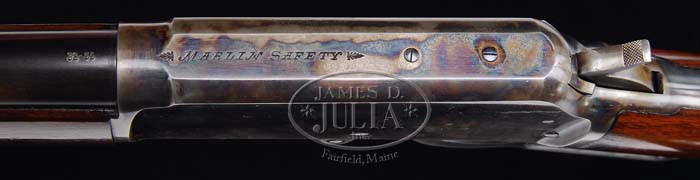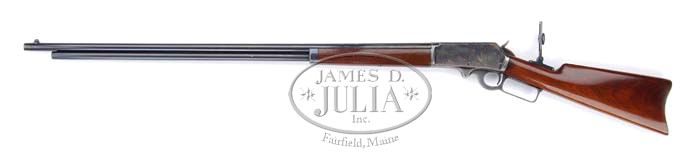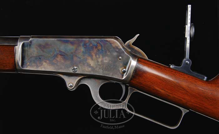 *RARE SPECIAL ORDER MARLIN 1893 STANDARD GRADE LEVER ACTION RIFLE. SN 313905. Cal. 38-55. 32″ rnd bbl, 30″ mag. tube, ivory bead Lyman front sight blank and rear seat. Standard receiver with tang mounted thick base sight having nicely figured walnut, uncheckered straight grip, Marlin rifle buttplate and standard rifle forend. PROVENANCE: Dr. Frank Miller Estate Collection. CONDITION: Very fine. This special ordered 32″ bbl retains 93-95% original blue with a couple minor nicks and scuffs and some thinning behind rear sight dovetail from carrying. Magazine tube has 93-95% original blue with some thinning on bottom towards front and a minor nick on left side about 4″ from forend cap. Receiver retains 95% strong original case colors with some thinning across bottom. Hammer has most of its original case colors and lever likewise has most of its original case colors and fading to silver. Tang sight has 3″ staff. Stock is solid with a few minor nicks and dings, small area of discoloration between tangs on the left side also top of comb near buttplate with a cleaned and possibly light coat of added finish. Forend is solid with a couple of nicks and minor scratches and likewise cleaned and possibly a light coat of added finish. Mechanics are crisp and bore is bright and shiny. 4-35678 BDT137 (8,000-12,000)