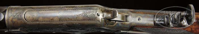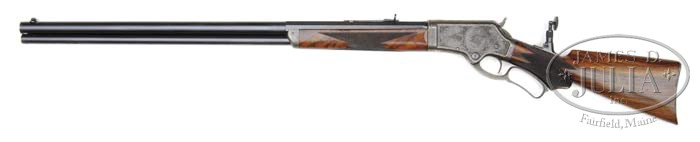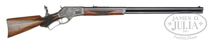 RARE SPECIAL ORDER DELUXE ENGRAVED MARLIN MODEL 1881 LEVER ACTION RIFLE. SN 22820. Cal. 40-65. Beautiful deluxe engraved rifle with 30″ heavy oct to rnd bbl, full magazine, ivory bead front sight with broken bead, semi-buckhorn rear sight and Lyman #15 windgage tang sight. Mounted with “B” style checkered English or Italian walnut with serpentine grip cap & smooth shotgun steel buttplate. Left side of top & bottom tangs are marked with the SN as is the buttplate. Buttstock is unmarked but there is no doubt that this is the orig buttstock. Receiver is engraved in modified #2-style with the rnd vignette of a bull moose head on left side and a walking bull moose in a forest scene on right side, surrounded by foliate arabesque patterns. Top & bottom of receiver are engraved to match. Engraving is probably by John Ulrich. According to the book Marlin Firearms, Brophy, in a chart on p. 159, there were only 780 Model 1881 rifles with 30″ bbls and only 1,303 with pistol grip. PROVENANCE: Wes Adams Estate Collection. CONDITION: Extremely fine. Bbl & magazine tube retain 96-97% strong orig blue with only sharp edge wear; receiver retains strong case colors on sides, moderately faded over the top and turned silver on bottom; hammer also retains strong case colors and the lever moderately to heavily faded case colors; buttplate retains about 50% silvered case colors; stock has a hairline in the wrist on right side at receiver, otherwise wood is sound with usual scattered, light nicks, scratches & dings and retains most of its orig factory varnish. Tang screw & one buttplate screw are battered. Mechanics are crisp, bright shiny bore. 4-44647 JR428 (20,000-35,000)