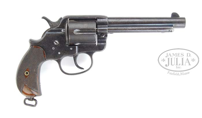 SCARCE EARLY COLT 1878 DA FRONTIER REVOLVER. SN 7380. Cal. 455 Eley. All blue finish with 5-1/2″ bbl, full front sight with Hartford & Pall Mall addres. Left front web of trigger guard has caliber marking and there are tiny British proofs on bottom of bbl & on ylinder. It has usual round butt grip frame mounted with diamond checkered walnut grips and has a lanyard stud & ring in butt strap. Last two digits of the serial number are on the rear face of the cylinder between chambers. While not produced in large numbers, this large frame Colt saw considerable popularity both in the United States & Europe due to its large caliber and similarity to the Colt Single Action with the addition of the dbl action function. CONDITION: Very good to fine, all matching including grips. Overall retains about 75% orig blue mixed with flaked patina and fine pin prick rust pitting. Grips are very fine showing light wear and retain most of their orig varnish. Mechanics are crisp, strong bore with moderate pitting. This revolver appears to have had little use, mostly poor storage. 4-37931 JR183 (1,500-2,500)