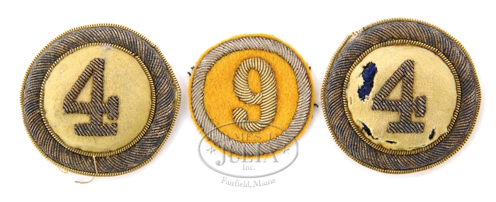 CAVALRY REGIMENTAL INSIGNIA. Three regimental numbers, two “4” and one “9”, made of bullion woven on yellow fields. These are the types of numbers worn on officer’s dress epaulets. The number “4” measure approx1-7/8″ diameter and the “9” measures approx 1-1/2″ diameter. CONDITION: Number “4” insignia are good to very good with one of them exhibiting considerable moth damage. The other is near excellent. Number “9” is near excellent. 4-32443-1 DM126 (50-100)