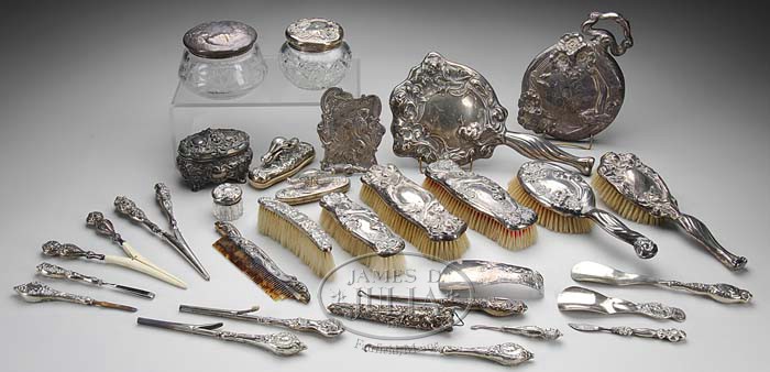 30 ART NOUVEAU DRESSER PIECES. Pieces in this lot including two hair brushes, a tortoise shell comb, four hand brushes, three shoe horns, three hooks, holder, two scissors, three blades, pin dish, jewelry box, two nail buffers, two mini hair wavers, two hand mirrors, two powder boxes and small cream jar. Pieces are not a set, just a nice assortment of vintage dresser accessories. One hand mirror monogrammed “Hazel”. Some pieces marked “Sterling”. SIZE: Hand mirror is 12″ l. PROVENANCE: From the Estate of Geraldine Gaba, Scottsdale, AZ. CONDITION: Overall very good, minor fleabites to rims of powder jars and minor silver loss to one mirror. 5-68326 (1,000-1,500)
