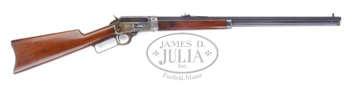 *SPECIAL ORDER MARLIN MODEL 1894 TAKEDOWN LEVER ACTION RIFLE. SN 369660. Cal. 25-20. 24″ octagon bbl, full magazine takedown, fine silver bead front sight, and sporting rear with set screw. Standard takedown frame mounted with straight grain walnut, uncheckered straight grip, and steel Marlin rifle buttplate. PROVENANCE: Dr. Frank Miller Estate Collection. CONDITION: Very fine. Bbl and magazine tube retains 95% original blue with some thinning to sharp edges and some light thinning in chamber area. Receiver retains 85-90% original case color with thinning of takedown lever and ring. There are a couple of minor areas of brown patina on upper left side. Bolt has 80% original blue with an area flaked to brown patina. Hammer has strong original colors with wear on left side. Lever has strong original colors on side and thinning to silver and brown patina on bottom. Stock is sound with a few minor nicks and dings and carries most of its original finish. Buttplate has 60-70% blue, worn to silver at heel and toe. Forend has a few light nicks and scratches and one ding center of left side with most of its original finish with small area worn through on right side. Mechanics are crisp with a shiny bore and strong rifling. 4-35684 BDT135 (2,500-3,500)