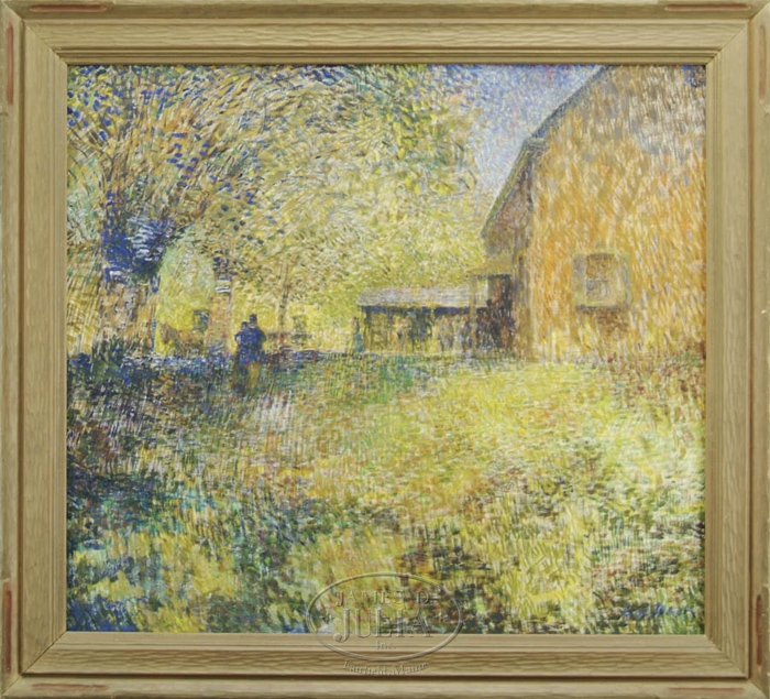 LEAL MACK (American, 1892-1962) SUMMER GATHERING. Large oil on canvas colorful scene in the pointillist technique shows a large barn/house which has several carriages and groups of people outside. Large trees and a colorful garden complete the picture of an important gathering. Signed lower right “Leal Mack”. Housed in a fine period carved wood frame. SIZE: 30” x 34”. CONDITION: Very good. There are two small punctures. 9-28973 (3000-5000)